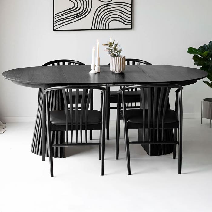 Je begint met een ronde tafel van 120 cm en schuift hem eenvoudig uit tot 200 cm. Dit doe je met twee extra platen van elk 40 cm die je in het midden legt, terwijl de stoere half ronde poten aan de uiteinden mooi zichtbaar blijven. De tafel is afgewerkt met een fineerlaag die zorgt voor een warme, natuurlijke uitstraling. De poten met verticale houten latjes geven de Alko een moderne, minimalistische look die perfect past in uiteenlopende woonstijlen. Of je nu knus dineert met z’n tweeën of extra gasten ontvangt, de Alko maakt ieder etentje gezellig en stijlvol.