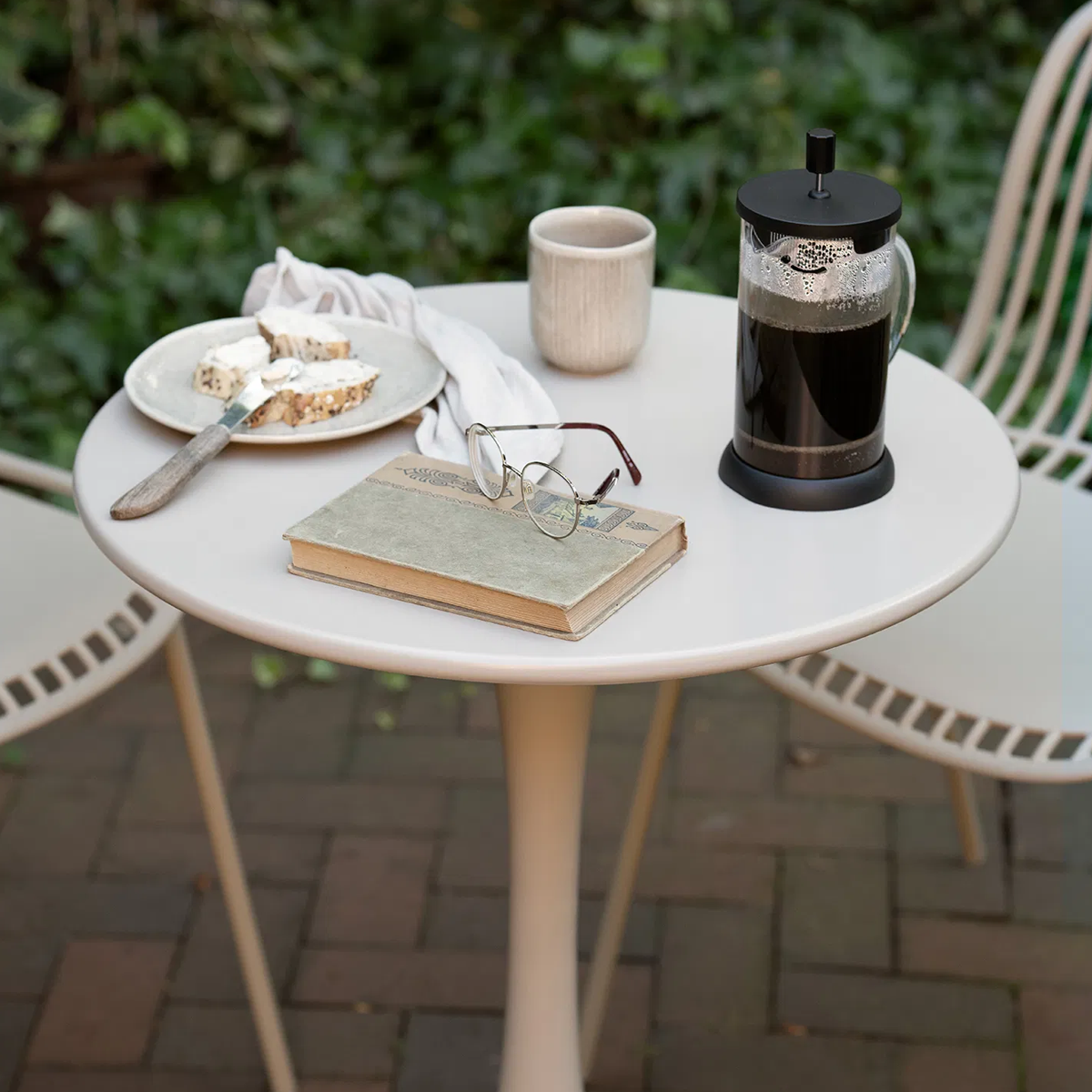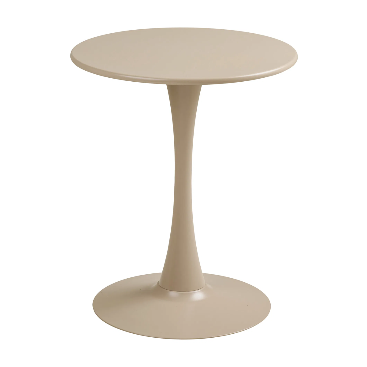 Deze beige Amyra ronde tafel is het perfecte bistrotafeltje voor gezellige momenten in de zon. De tuintafel heeft een diameter van 60 cm en dit compacte formaat ideaal is voor een balkon, klein terras of knusse zithoek. De elegante tulpvoet geeft de tafel een verfijnde en moderne uitstraling, terwijl het metalen ontwerp zorgt voor stevigheid en stabiliteit. De zachte beige kleur brengt rust en warmte in je buitenruimte en laat zich moeiteloos combineren met verschillende stijlen. Dankzij het duurzame metalen materiaal is de tafel geschikt voor zowel binnen als buitengebruik. Perfect voor een kop koffie in de ochtendzon of een borrel aan het einde van de dag. Een klein tafeltje met een groots effect.