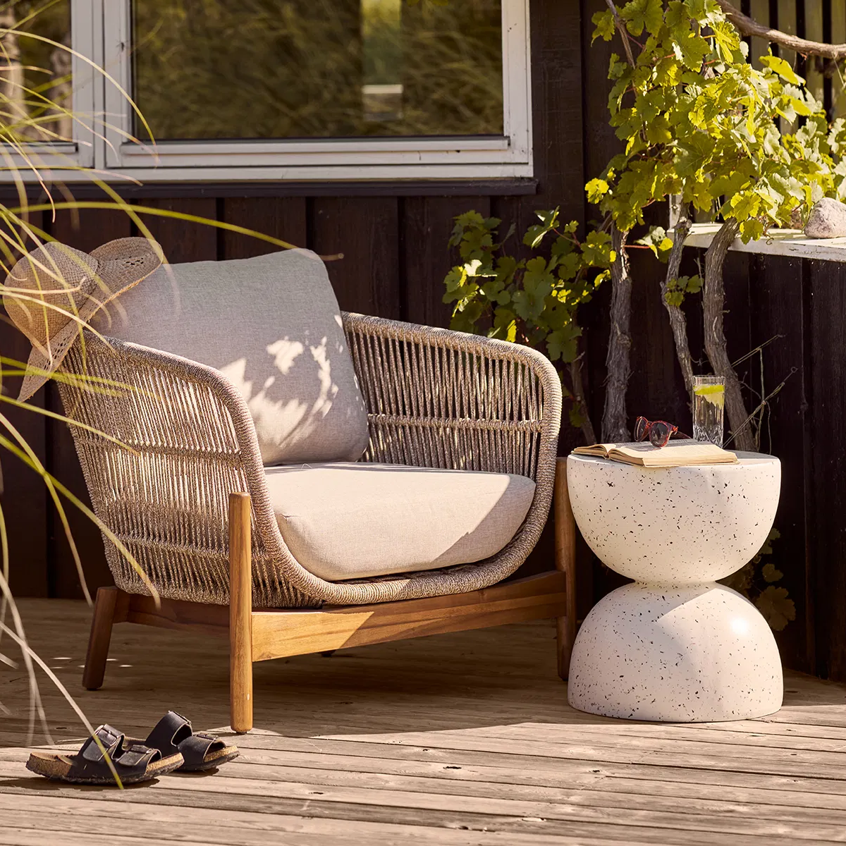 De tafel is gemaakt van fiberclay: een sterk en duurzaam materiaal dat bestaat uit een mix van glasvezel en klei. Hierdoor is de tafel relatief licht van gewicht, maar toch stevig en bestand tegen verschillende weersinvloeden. Dat maakt de Bona bijzettafel geschikt voor zowel binnen als buitengebruik. Een veelzijdig item dat moeiteloos sfeer brengt in iedere ruimte – van woonkamer tot terras.