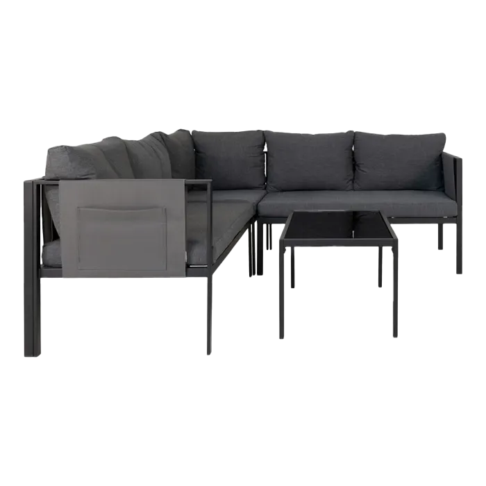 Heerlijk genieten van het buitenleven doe je met deze metalen loungeset van Artichok. De comfortabele loungeset heeft een hoekbank en wordt inclusief zitkussens geleverd. De Clara lounge set bestaat uit een hoekbank en een bijpassende salontafel. Het frame van de bank is gemaakt van zwart gepoedercoat staal en de zitkussens zijn gemaakt van polyester. Het frame van de salontafel is ook gemaakt van staal en het tafelblad is gemaakt van gehard glas. Dit glas is sterker dan normaal glas en heeft daarom ook de naam veiligheidsglas. Kleed de Clara tuinset verder aan met een zachte plaid, leuke sierkussens, en verlichting en jouw zithoek is klaar voor lange zomeravonden. Om de loungeset langdurig mooi te houden, raden wij aan de zitkussens na gebruik naar binnen te halen en de de gehele set op te bergen of af te dekken in de winter.