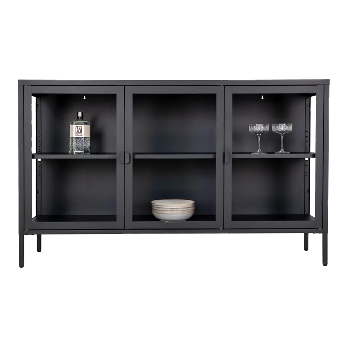 Berg je mooiste voorwerpen op in de metalen vitrinekast Dagmar van Artichok. Deze lage vitrinekast is gemaakt van metaal en heeft glazen deurtjes. Ook de zijkanten van de kast zijn van glas, dus je kan er vanuit elke hoek in kijken. De kast staat op vier slanke metalen pootjes en heeft drie deurtjes, waarachter je je spullen kan opbergen of uitstallen. Er zitten geen tussenschotten in de kast. De afmeting van deze vitrinekast is 140 centimeter breed, 40 centimeter diep en 85 centimeter hoog. Door deze hoogte kan je ook perfect een mooie lamp, plant of kaarsen boven op de kast zetten. Ook houd je genoeg muur over voor een mooie poster of leuke foto's. Binnenin de kast zit één plank, die over de gehele breedte van de kast loopt. Zo is er genoeg ruimte voor al jouw boeken, tijdschriften, mooie accessoires en verzamelingen. Voordelen
