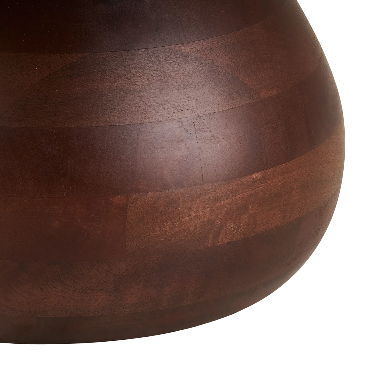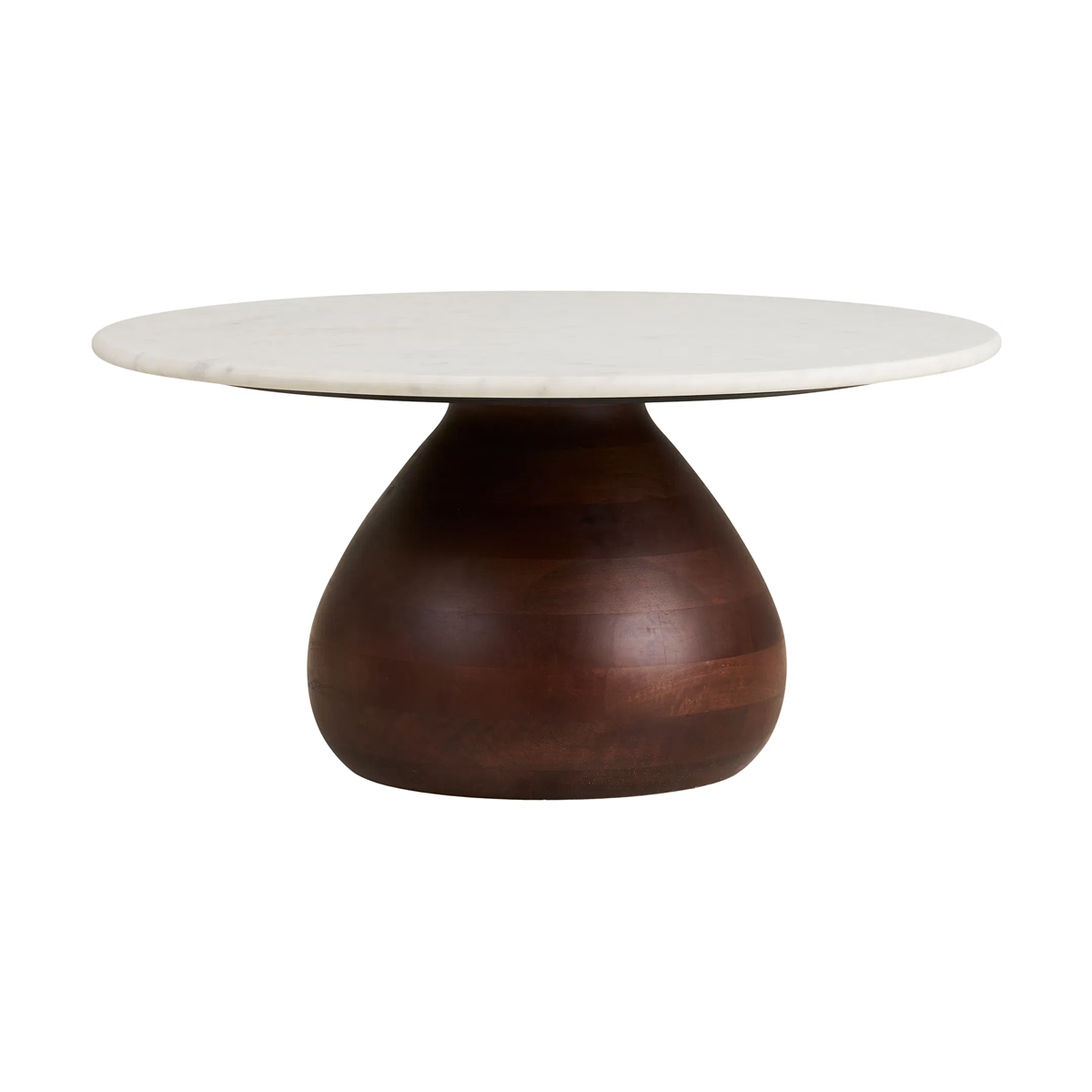 Deze salontafel uit de Herre lijn heeft een diameter van 70 cm en vormt daarmee een stijlvolle blikvanger in je zithoek. De donkerbruine poot van mangohout, uitgevoerd in de kenmerkende druppelvorm, geeft de tafel een warme en krachtige basis. Het witte marmeren blad zorgt voor een fris contrast en voegt een luxe, natuurlijke uitstraling toe aan het geheel.