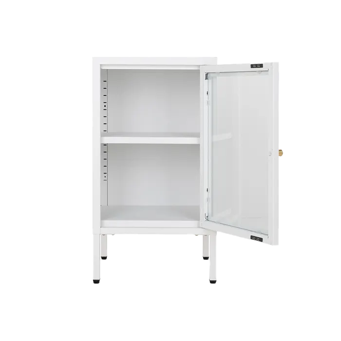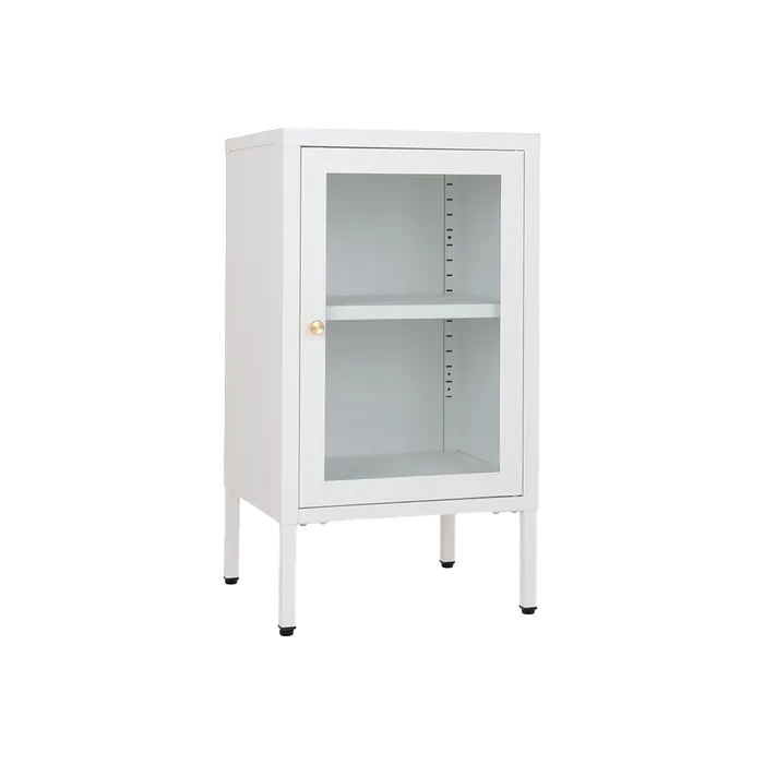 De James opbergkast is een stijlvolle metalen kast in industriële stijl. De kast is gemaakt van metaal en is verkrijgbaar in de kleuren wit en zwart. Het deurtje is voorzien van een glasplaat, waardoor je leuke accessoires die in de kast staan goed kan zien. Wil je spullen juist uit het zicht houden? Zet dan een mooie mand in de kast en berg de spullen daarin op. Het deurtje van de opbergkast is voorzien van een gouden deurknop die de kast een elegante touch geeft. Voordelen