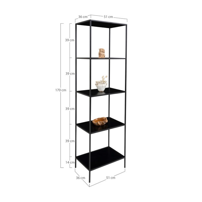 De Karen open kast fleurt je muur in de woon- of slaapkamer helemaal op. Decoreer de Karen met leuke planten en fotolijstjes om de kast te personaliseren. Doordat de kast gemaakt is van metaal met zwart houten planken geef je de ruimte een industriële en stoere sfeer. De Karen kast biedt je voldoende opbergruimte met zijn vijf planken. Voordelen