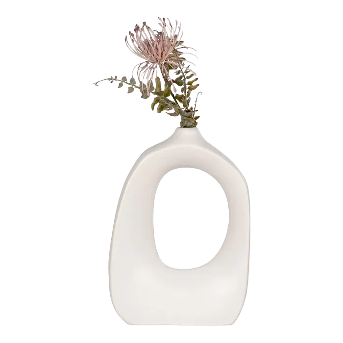 Deze prachtige keramische vaas van Artichok is een musthave voor jouw vazen collectie. De Loa vaas is gemaakt van keramiek in een offwhite kleur. De vaas is 20 cm breed, 19 cm diep en 27,5 cm hoog. De vaas heeft een opvallende organische vorm met een opening in het midden. Vul de vaas met droogbloemen of pluimen, of laat het mooie ontwerp voor zich spreken. Keramiek is waterdoorlatend dus deze vaas is niet geschikt om te vullen met water voor verse bloemen Voordelen