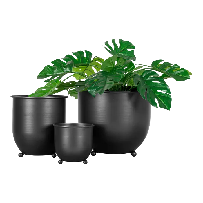 Ben je op zoek naar een mooie bloempot voor jouw planten binnen? Met de Riek bloempotten set heb je er direct drie die bij elkaar passen! De Riek bloempotten set van Artichok bestaat uit drie bloempotten van verschillende afmetingen. De bloempotten zijn gemaakt van staal en hebben een zwarte kleur. De potten hebben alle drie een andere afmeting: Ø11 x 10 cm hoog, Ø16 x 17 cm hoog en Ø22 x 19 cm hoog. De potten hebben een ronde vorm en staan ook op vier kleine ronde pootjes. Omdat de bloempotten van staal zijn, kan je ze het beste binnen gebruiken. Zet ze neer als groepje van drie of verspreid ze door het huis. Zo heb je een accent wat in meerdere ruimtes van het huis terugkomt en cre√´er je dus eenheid in je inrichting. Ze zijn licht van gewicht, dus je kan ze gemakkelijk verplaatsen. Zodra je een plekje hebt gekozen hoef je ze alleen nog maar met mooie planten te vullen. Voordelen