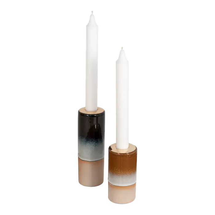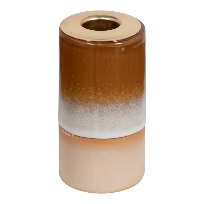 Breng extra sfeer in huis met de mooie Sofia kandelaar van keramiek. De Sofia kandelaar van Artichok is gemaakt van keramiek met een reactieve glazuurlaag. Hierdoor heeft de kandelaar een mooi verloop van kleuren: van roestbruin naar oranje, wit en zalmroze. Aan de bovenzijde van de kandelaar zit een messing plaatje dat het kaarsvet opvangt. De Sofia kaarsenhouder heeft een diameter van 5 cm en een hoogte van 10 cm. De lage kandelaar heeft een eenvoudig ontwerp maar is toch een heel sfeervol decoratief item door de mooie kleuren. Hierdoor is de kandelaar perfect om een klein vleugje kleur toe te voegen in het interieur. Kaarsen zijn een must-have voor een romantische avond of een sfeervol diner: combineer meerdere kaarsenhouders en kandelaars met elkaar voor een gezellige setting. Voordelen