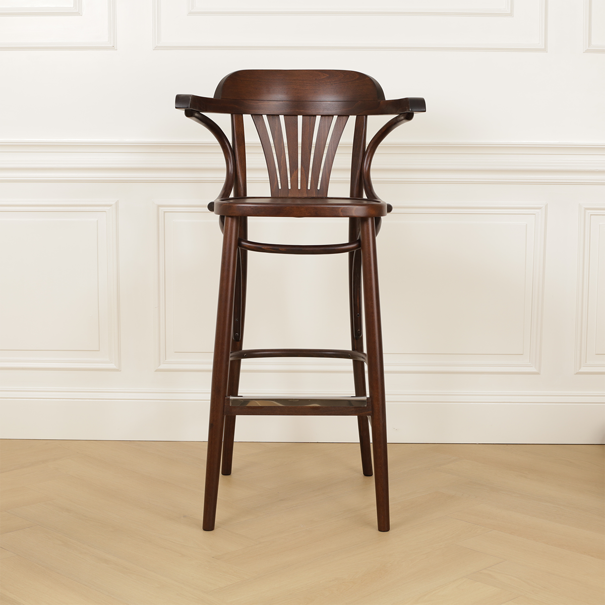 De Jos barkruk van Fameg combineert klassiek vakmanschap met een elegante uitstraling. Het ontwerp is geïnspireerd op de traditionele bistrostijl, maar krijgt door de gebogen houten lijnen en de walnootkleurige afwerking een warme, luxe uitstraling. De hoge rugleuning met sierlijke spijlen en de geïntegreerde armleuningen zorgen voor extra comfort, zodat je moeiteloos urenlang aan de bar kunt zitten. Met een zithoogte van 75 cm is de Jos barkruk ideaal voor hoge bartafels of een keukenbar. De stevige constructie van massief hout, gecombineerd met de voetensteun, maakt dit een duurzame en comfortabele keuze die perfect tot zijn recht komt in zowel moderne als klassieke interieurs. Voordelen