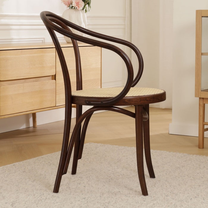 De Vienna Thonet No.9 eetkamerstoel is een icoon in de designwereld. Het buighout van meubelpionier Michael Thonet zorgt voor een klassieke twist in deze armstoel. De zitting van de stoel is gemaakt van stevig verweven rotan en de stoel beschikt over afgewerkte armleuningen. In de 19e eeuw ontdekte Michael Thonet een nieuwe manier om hout te buigen. Door met minder houtverbindingen en zonder lijm te werken, maakte hij meubels veel steviger, hierdoor zijn deze stoelen uniek! De met rotan verweven zitting maakt het zitten prettiger, waardoor je lekker lang kunt natafelen. Bovendien is de stoel verkrijgbaar in meerdere afwerkingen, waardoor er altijd een stoel is die bij jouw interieur past. Voordelen