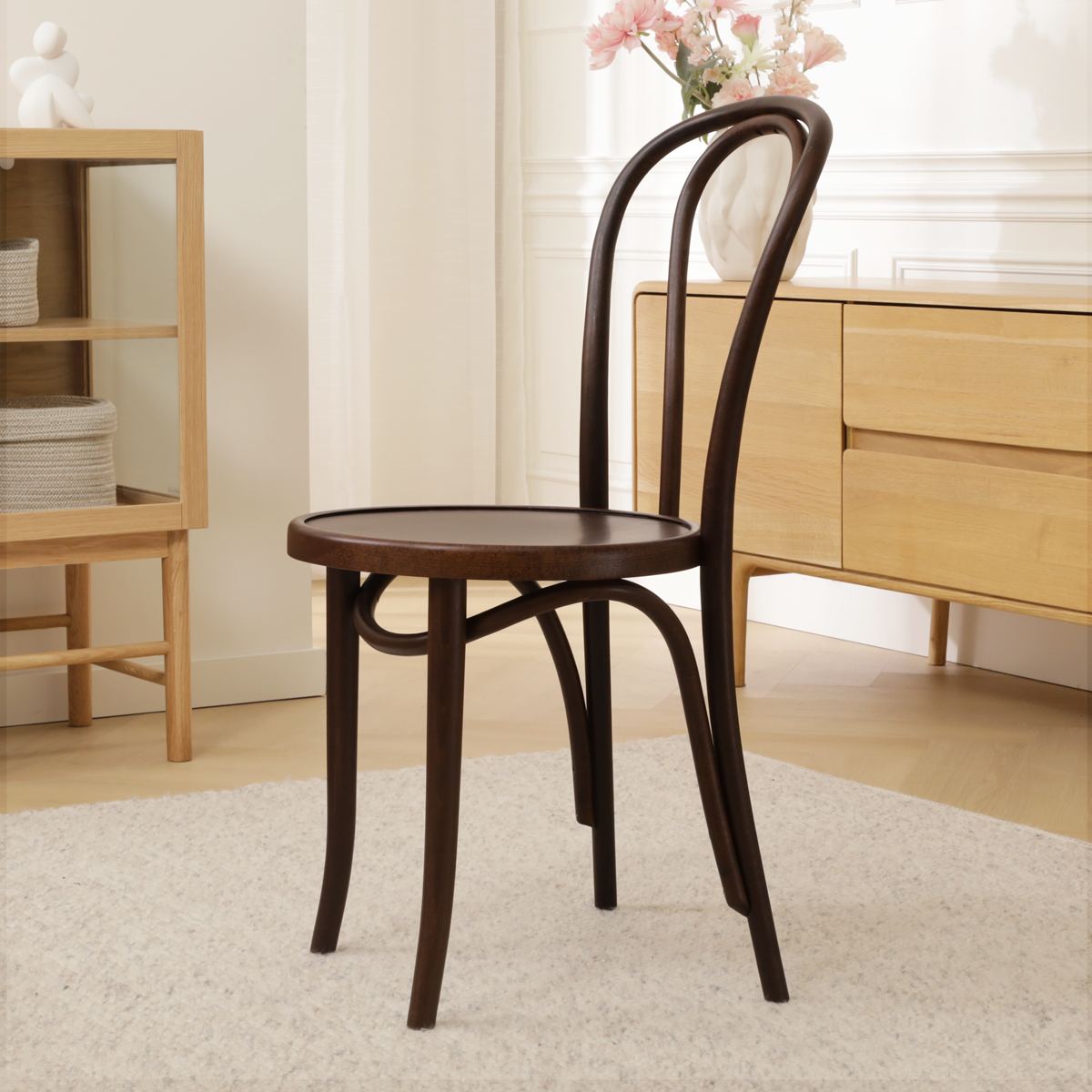 De Vienna No. 18 bistrostoel van Thonet is 1 van de meest succesvolle stoelontwerpen ooit. Deze superstevige houten cafe stoel, met de herkenbare lus in de rugleuning, past in ieder modern interieur. De ronde zitting zorgt voor een comfortabele zit. Het elegante, open design van de stoel maakt hem bovendien heel geschikt voor horecagebruik. Rond 1830 ontdekte meubelpionier Michael Thonet een nieuwe manier om hout te buigen. Door met minder houtverbindingen en zonder lijm te werken, maakte hij meubels veel steviger. Het merk Fameg zet dit werk voort in een van de originele Thonet-fabrieken uit 1881. Er zijn al 60 miljoen exemplaren van deze stoel verkocht, in allerlei materialen, kleuren en uitvoeringen. Het design en de duurzaamheid van deze stoel worden al jaren geroemd. Wist je bijvoorbeeld dat deze stoel favoriet was onder kunstenaars als Pablo Picasso? Voordelen