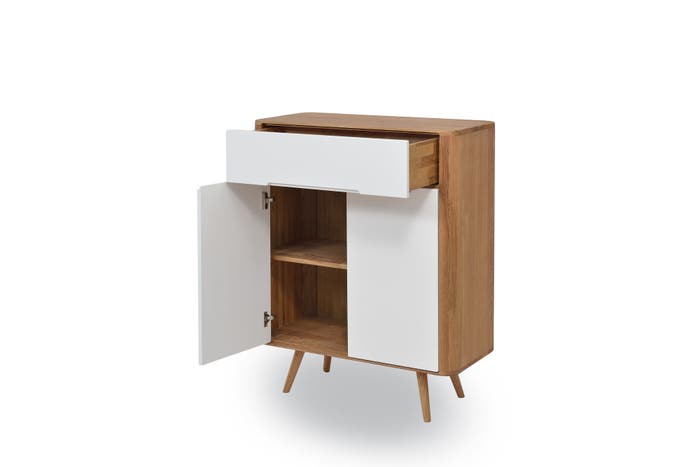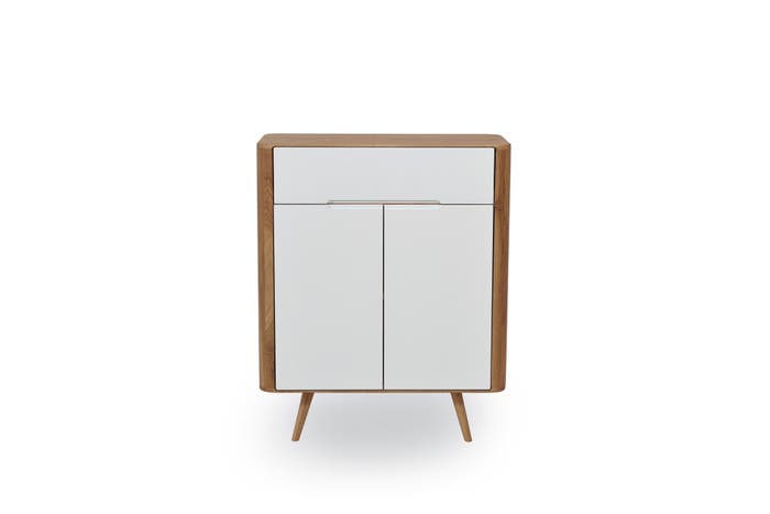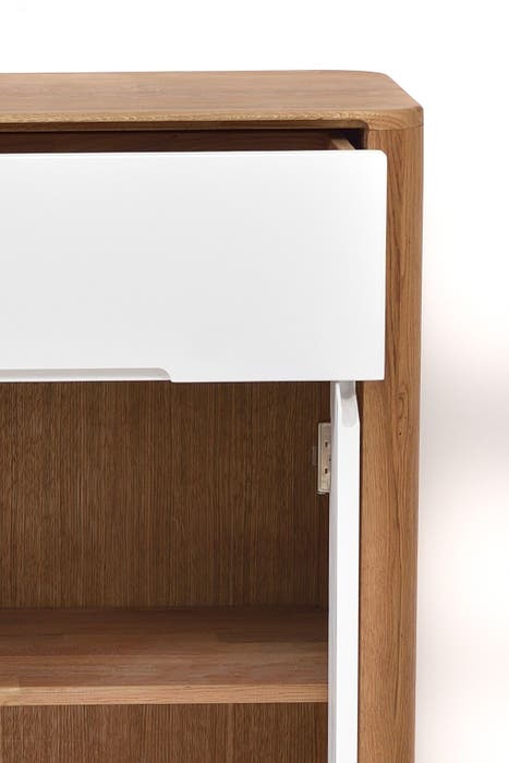 De Gazzda Ena Dresser One is een massief eikenhouten dressoir met genoeg opbergruimte voor je spullen. Het contrast tussen het prachtig afgewerkte eikenhout en de witte lade en deurtjes, zorgt voor een mix tussen vintage en modern. De Ena Dresser One is een massief eikenhouten opbergkast met één lade bovenin en daaronder twee deurtjes. Achter de deurtjes zit aan beide kanten één plank. De witte lade en deurtjes hebben het soft-close systeem. Dit zorgt ervoor dat de lade en deurtjes geleidelijk en geruisloos sluiten. Voordelen