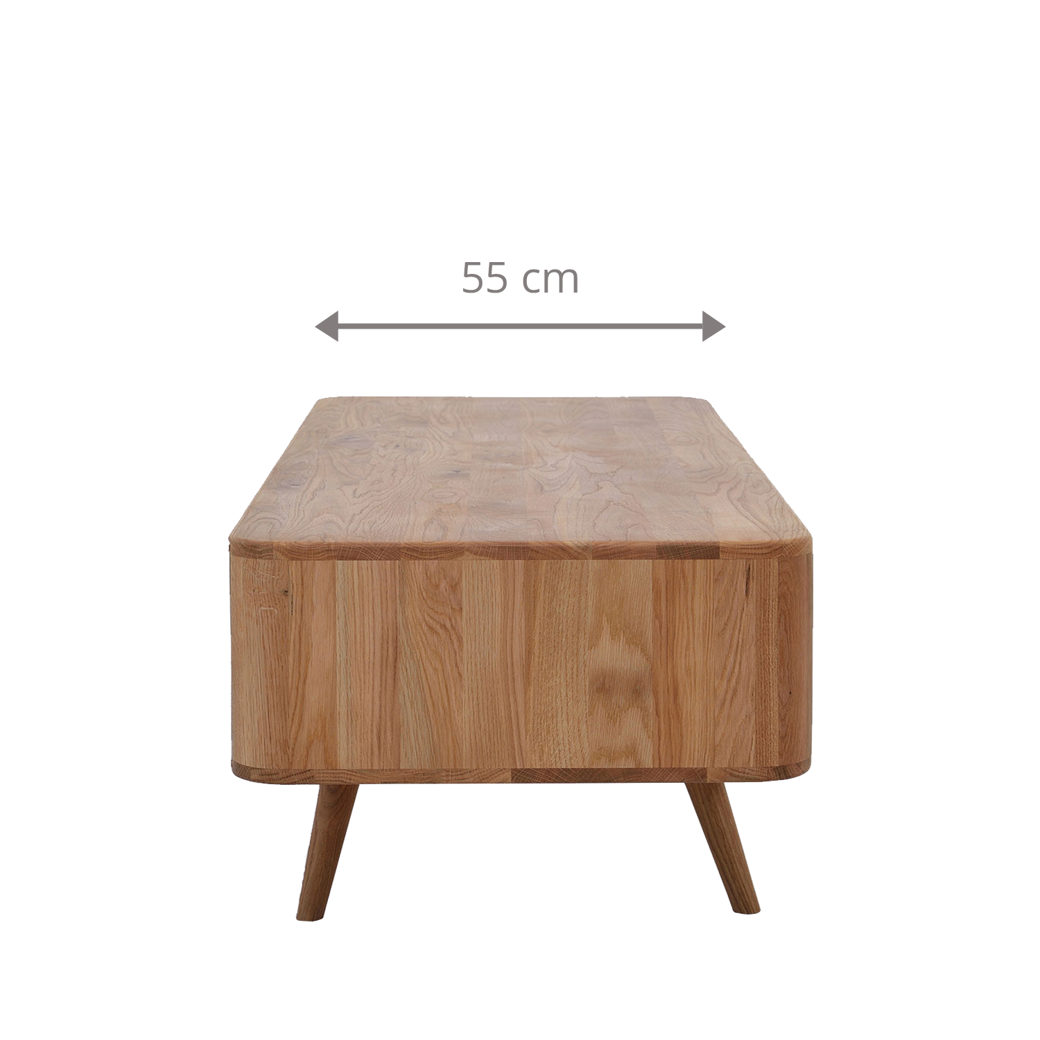 De afgeronde hoeken en de witte lades zijn geïnspireerd op de jaren '50 en zorgen voor een retro-moderne sfeer in jouw woonkamer. Het massief eikenhouten TV meubel heeft drie vakken. De buitenste vakken hebben lades en het middelste vak heeft een klep. Aan de achterzijde van het TV meubel zit een uitsparing voor de kabeldoorvoer. Dit maakt het TV meubel niet alleen mooi, maar ook heel functioneel.
