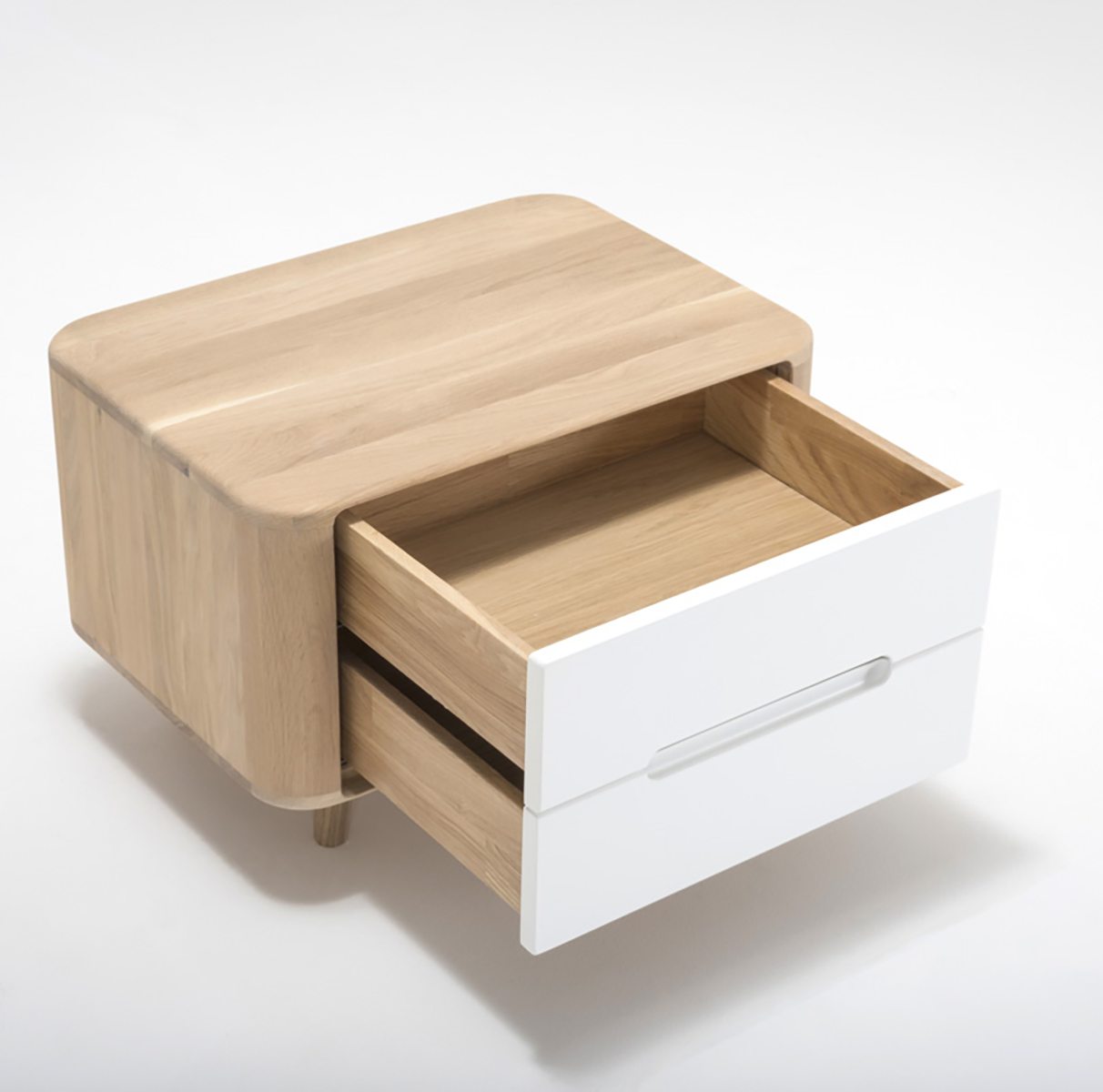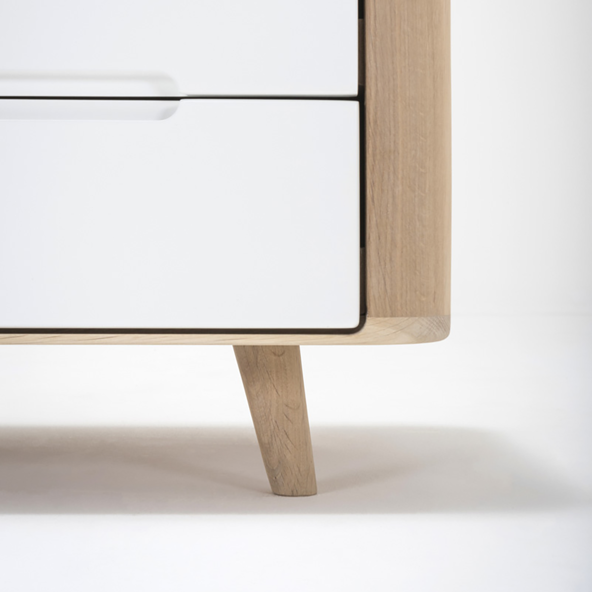 De Gazzda Ena Nightstand One is een retro nachtkastje die een karakteristieke sfeer meegeeft in elke slaapkamer. De combinatie van het eikenhout met de witte lades, geeft het nachtkastje een retro jaren ’50 look. De Ena Nightstand One is een massief eikenhouten nachtkastje met twee lades. Deze twee lades geven genoeg ruimte aan alle spullen die je voor het slapen gaan en bij het wakker worden nodig hebt. De twee witte lades hebben het soft-close systeem. Dit zorgt ervoor dat de lades geleidelijk sluiten. Ook zorgt dit ervoor dat de lades geruisloos sluiten - handig voor in de slaapkamer! Voordelen