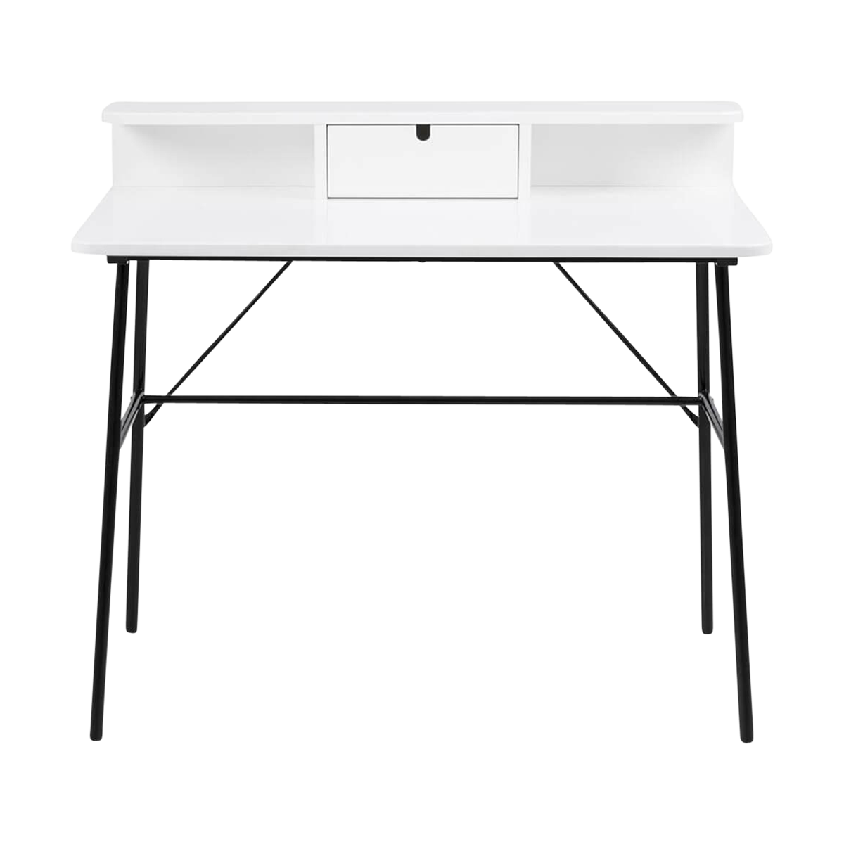 Met het houten bureau Lot haal je een stijlvol bureau in huis. Lot heeft een minimalistisch, modern design en oogt door de combinatie met de witte plank en het zwarte frame erg fris. Combineer het bureau met een witte stoel en je zit gegarandeerd lekker aan je nieuwe aanwinst. Om het bureau helemaal compleet te maken zet je je favoriete accessoires of een mooie plant erop! Bureau Lot is gemaakt van gelakt hout en is afgewerkt met een bijzonder zwart metalen frame. Het metalen frame is afgewerkt met een poedercoating. Bovenop het bureau is een la gemonteerd, zodat je hier gemakkelijk je spullen in kwijt kunt die je niet in het zicht wilt hebben. Bovendien is er nog een extra plank op gemonteerd, zodat je nog meer opbergruimte hebt. Voordelen