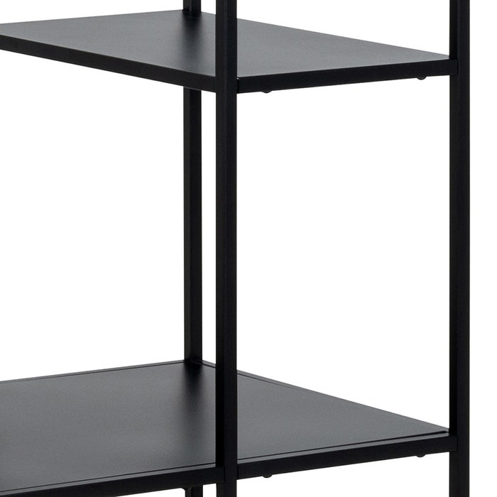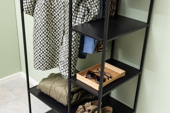 Met het metalen kledingrek Roy van Lisomme geef je jouw kleding een mooie plek. Het kledingrek is gemaakt van zwart metaal en is afgewerkt met een matte poedercoating. Het rek heeft een asymmetrische indeling en is ontworpen met vijf planken en een stang. Met zoveel ruimte is dit rek ideaal om als kast voor al je kleding te gebruiken. Hang je mooiste kleding op aan de roede en gebruik de planken voor de rest van je garderobe. Het Roy kledingrek kan je natuurlijk ook in de hal gebruiken om alle jassen op te bergen. Voordelen