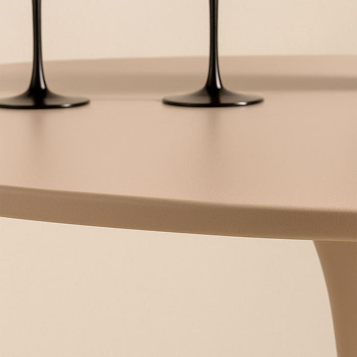 Met zijn ronde vorm van 100 cm en het speelse trompetvoet design is Amy een echte eyecatcher die tegelijkertijd luchtigheid en warmte in je interieur brengt. De beige afwerking geeft de tafel een moderne, rustige uitstraling die perfect aansluit bij Scandinavische en Japandi woonstijlen.