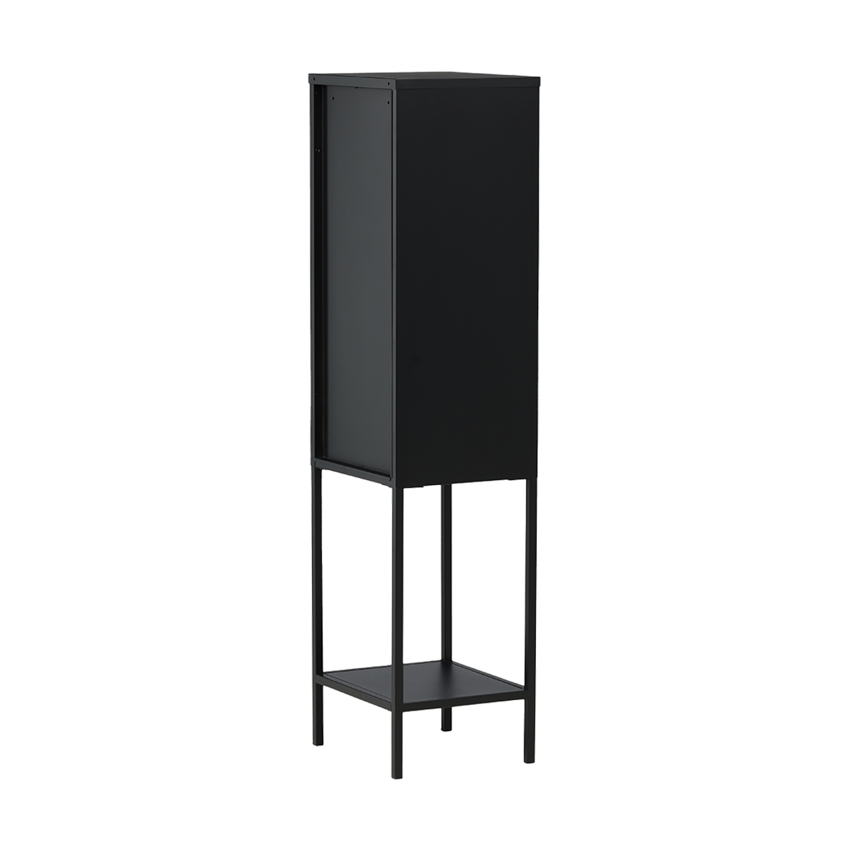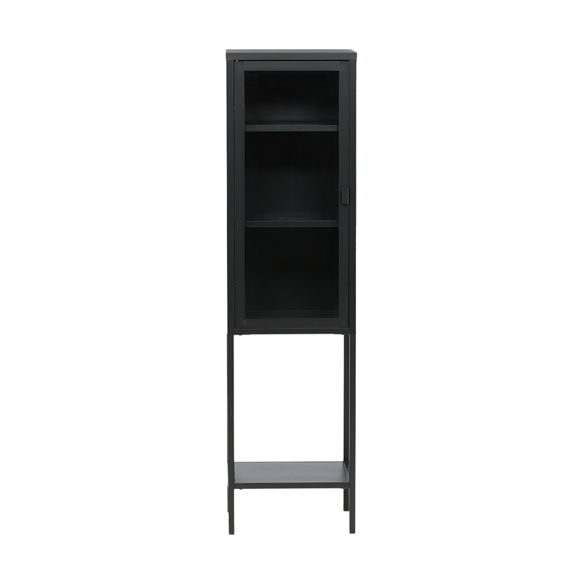 Op zoek naar een industriële en stijlvolle kast voor je interieur? De Claes metalen vitrinekast van Nest Living is precies wat je zoekt. Deze prachtige metalen kast biedt de perfecte oplossing voor het tentoonstellen en opbergen van je mooiste decoraties en waardevolle bezittingen. Dankzij zijn strakke ontwerp past hij fantastisch in een industrieel of modern interieur. De vitrinekast heeft aan de binnenzijde twee planken, afgesloten met een glazen deur. Onderaan bevindt zich nog een extra plank om nog meer spullen op te bergen, zoals een mooie plaid of een sfeervolle mand. Dankzij zijn ruime afmeting van 40,5 x 150 cm biedt de opbergkast voldoende ruimte voor het uitstallen van boeken, servies, kunstwerken en andere decoratieve items. Door zijn zwarte kleur past hij in verschillende woonruimtes. Zet Claes in de woonkamer, het kantoor of gebruik hem in de slaapkamer. Voordelen en tips: