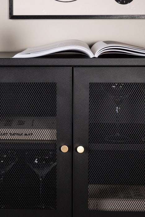 Het Sita dressoir van Nest living is een modern metalen dressoir in industriële stijl. Het dressoir is volledig gemaakt van staal en is in beige en grijs verkrijgbaar. De drie deurtjes zijn afgewerkt met gaas, waardoor je mooie accessoires in de kast kan zien staan. De gouden deurknoppen zorgen voor een chique touch. De kast staat op smalle, hoge poten die ervoor zorgen dat het geheel luchtig oogt. De hoogte vanaf de grond tot aan het dressoir is 30 centimeter. Vul het Sita dressoir met serviesgoed, boeken of mooie decoraties en geniet van de mooie aanblik in je woonkamer. Voordelen