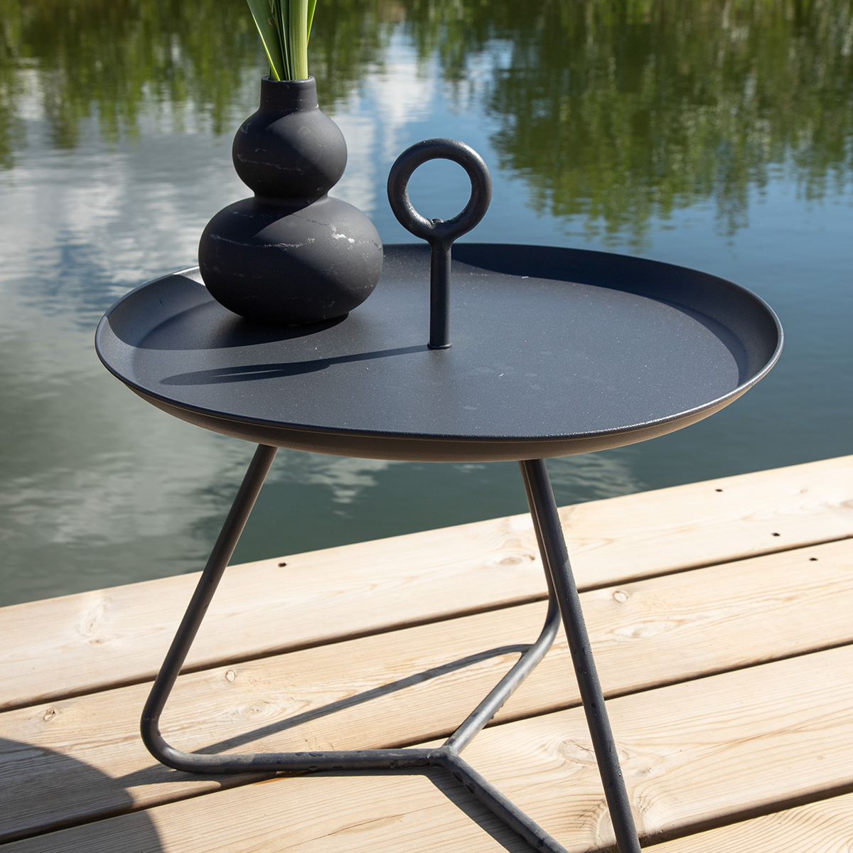 De Elias metalen bijzettafel van Nest outdoor is een multifunctioneel tafeltje voor in de tuin. Het tafeltje heeft namelijk een compact formaat en een handig handvat waardoor je de tafel eenvoudig op een andere plek in de tuin neerzet. Of je nu geniet van een kopje koffie in de schaduw op het terras of lekker in de zon ligt, de Elias tuin bijzettafel neem je gemakkelijk met je mee. De ronde bijzettafel voor de tuin is volledig gemaakt van staal met een zwarte poedercoating, wat ideaal is voor gebruik in de tuin. Dit duurzame materiaal gaat lang mee en is bovendien erg stevig. Waar je ook buiten ook een tafel voor nodig hebt, de Elias tuin bijzettafel komt zeker van pas! Voordelen en tips