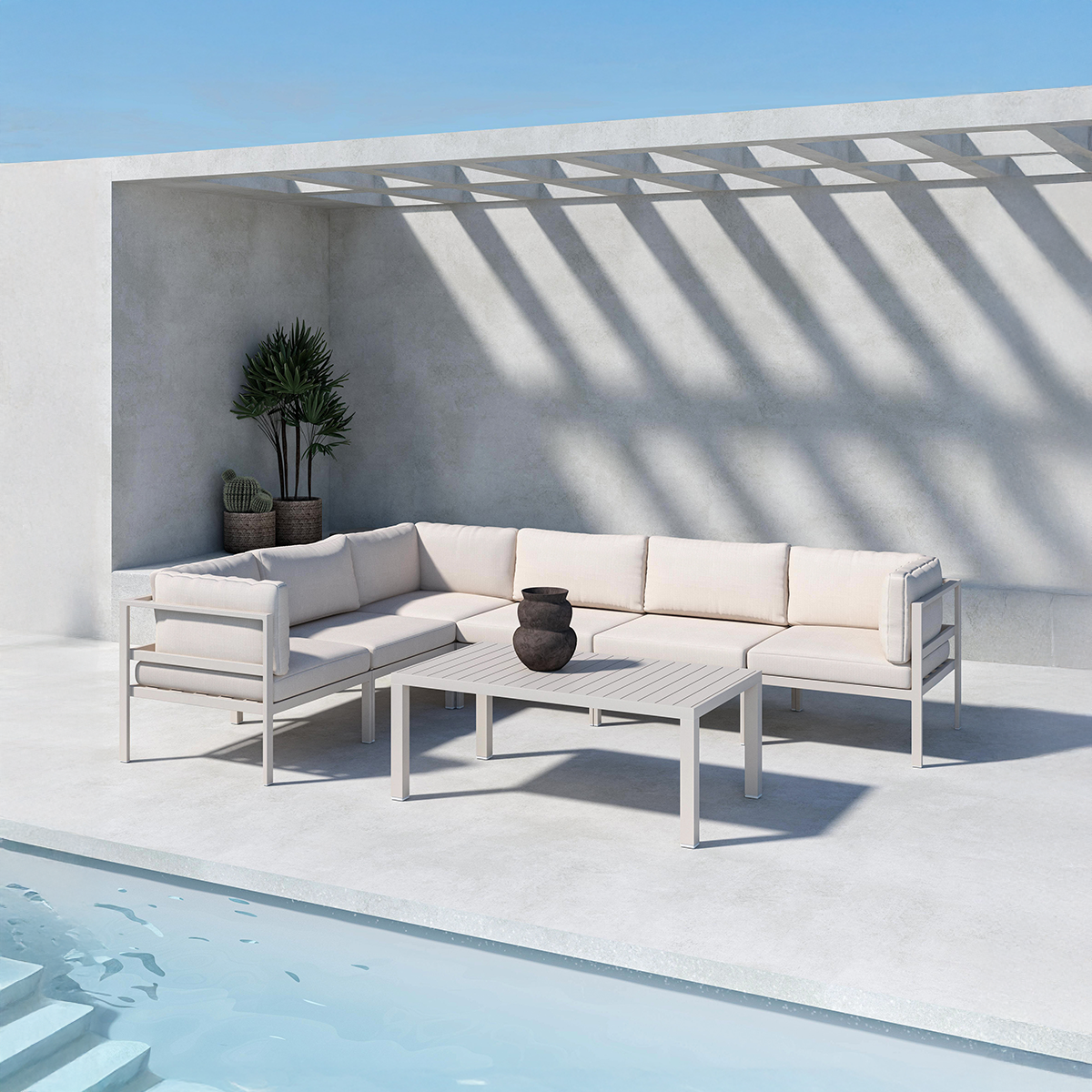 Het Glen element van Nest Outdoor is een strak vormgegeven loungedeel dat je flexibel kunt inzetten om jouw ideale tuinbank samen te stellen. Gebruik dit middenstuk als uitbreiding van je loungeset, verbind twee hoeken tot een ruime bank, of combineer meerdere elementen voor een moderne outdoor loungebank op maat. Dankzij het modulaire ontwerp bepaal jij zelf de grootte en vorm – handig als je je tuin of terras regelmatig anders inricht. Het aluminium onderstel is licht van gewicht en afgewerkt met een matte, poedercoat toplaag. Het dikke zit- en rugkussen zijn bekleed met olefin: een sterke buitenstof van polyester die tegen een stootje kan. Olefin is slijtvast, kleur- en vlekbestendig, schimmelwerend én uv-bestendig. En toch voelt het materiaal verrassend zacht aan – ideaal dus voor urenlang loungen. Voordelen en tips