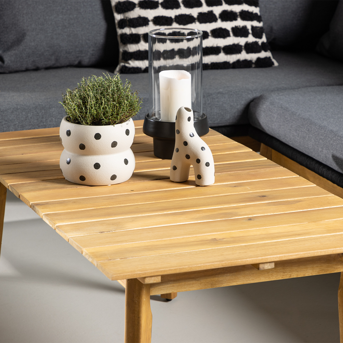 De Pam loungeset van Nest Outdoor is jouw complete relaxplek voor buiten: een stijlvolle grijze hoekbank met zitkussens, een salontafel én een prachtig gevlochten rugleuning van touw. De combinatie van warm acaciahout, neutraal grijze kussens en het open gevlochten touw geeft de set een natuurlijke, ontspannen look – perfect voor een tuin, terras of ruime veranda. De hoekbank biedt genoeg zitruimte om met z’n tweeën of meer te genieten van een lange zomeravond. De foam gevulde zitkussens zorgen voor optimaal comfort en nodigen uit tot urenlang loungen. De bijpassende salontafel van is ideaal voor je drankjes, een hapje of een goed boek. Doordat hij dezelfde houttint heeft als het bankframe vormt het geheel één rustige, stijlvolle set. Maximaal belastbaar gewicht voor de linker bank is 200 kg en voor de rechter bank 400 kg. Salontafel L110 x B60 x H45 cm Bank B210/160 x D75 x H76 cm Voordelen en tips