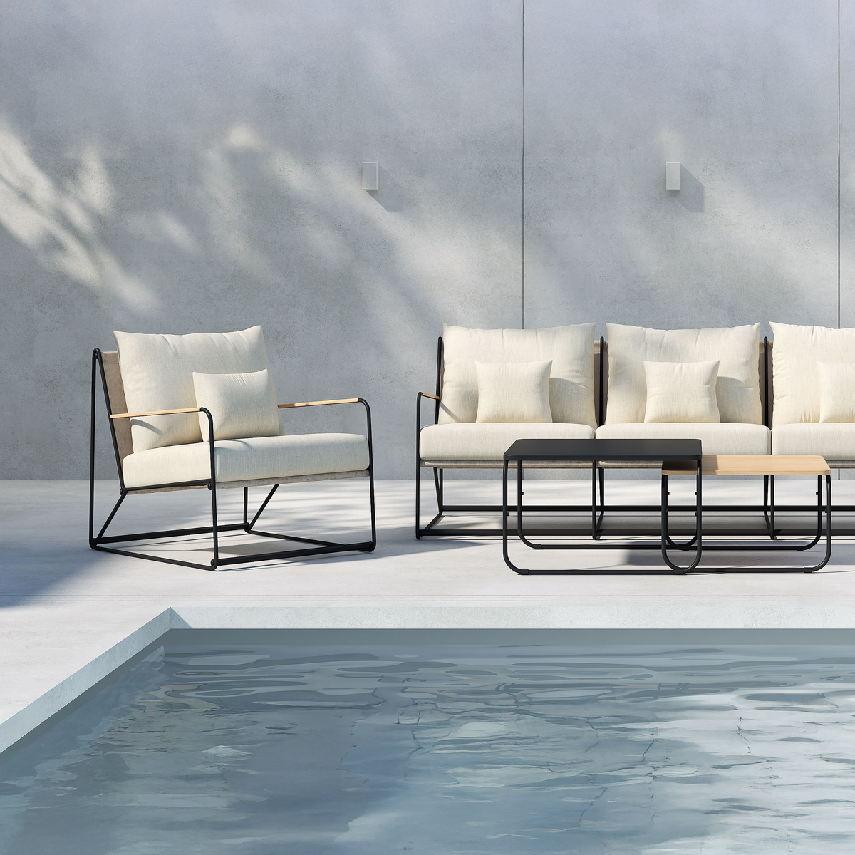 De set wordt compleet gemaakt door twee salontafels: een zwarte metalen tafel en een kleiner tafeltje met houten blad. Samen creëren ze een speels en praktisch geheel. Paolo is een royale loungeset waarin je heerlijk kunt ontspannen tijdens warme zomerdagen.