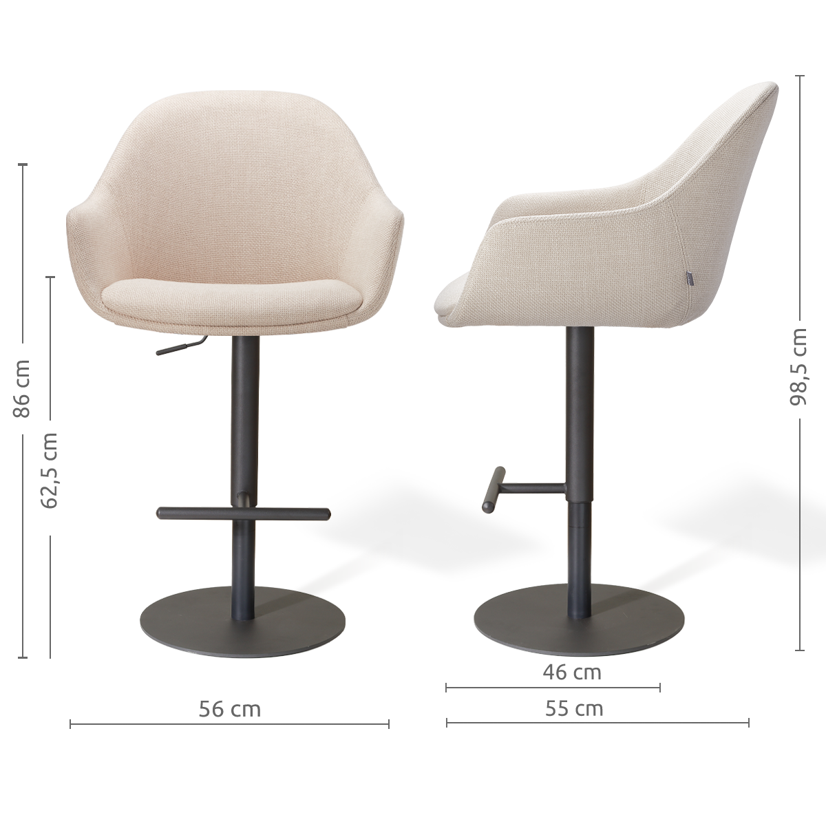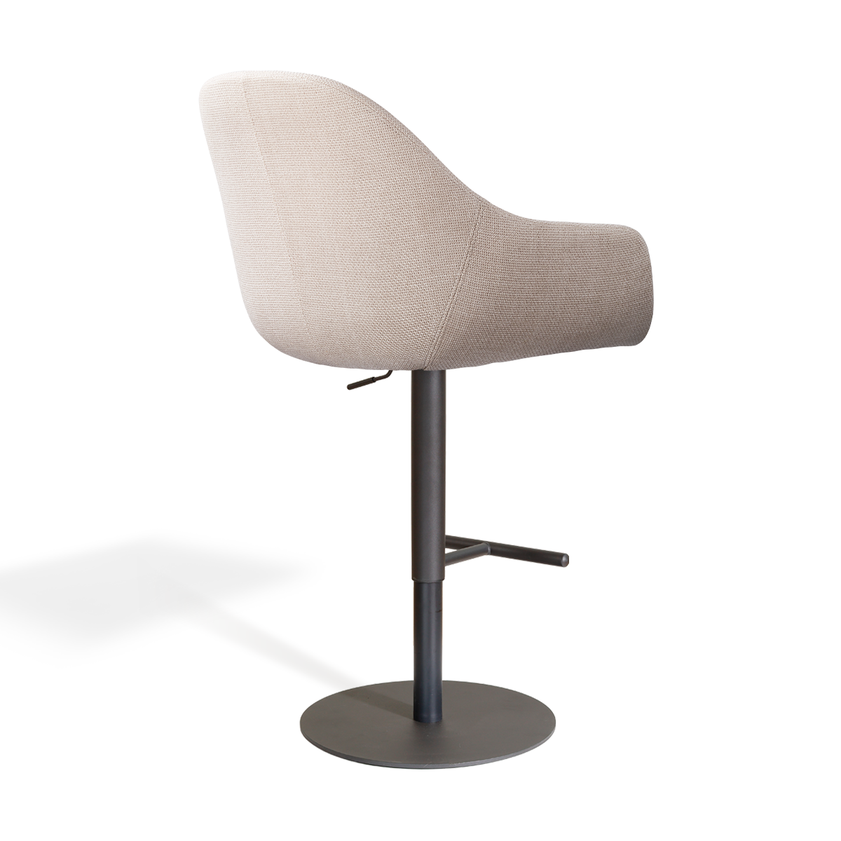 De Niva-Mae barkruk met zwart tulp onderstel combineert flexibiliteit met een krachtige, moderne uitstraling aan je kookeiland. Dankzij de verstelbare zithoogte pas je de barkruk eenvoudig aan op jouw kookeiland of bartafel. Het ruime bereik zorgt ervoor dat je altijd comfortabel zit, ongeacht de hoogte. De draaifunctie maakt het aanschuiven en opstaan extra makkelijk, zonder de barkruk te hoeven verplaatsen. De stoffen zitting met armleuningen zorgt voor een warme en ontspannen zit, terwijl het mat zwarte tulp onderstel de barkruk een stabiele basis en een strak, ruimtelijk karakter geeft. Zo blijft de ruimte rondom je kookeiland rustig en overzichtelijk. De zachte vormen zorgen voor een mooie balans met het zwarte onderstel en maken deze barkruk geschikt voor een Scandinavisch of Japandi interieur. Perfect voor een snelle koffie, een borrelmoment of een lange avond aan het kookeiland. Tips & adviesMet een paar eenvoudige tips blijft je stoel mooi en prettig in gebruik: