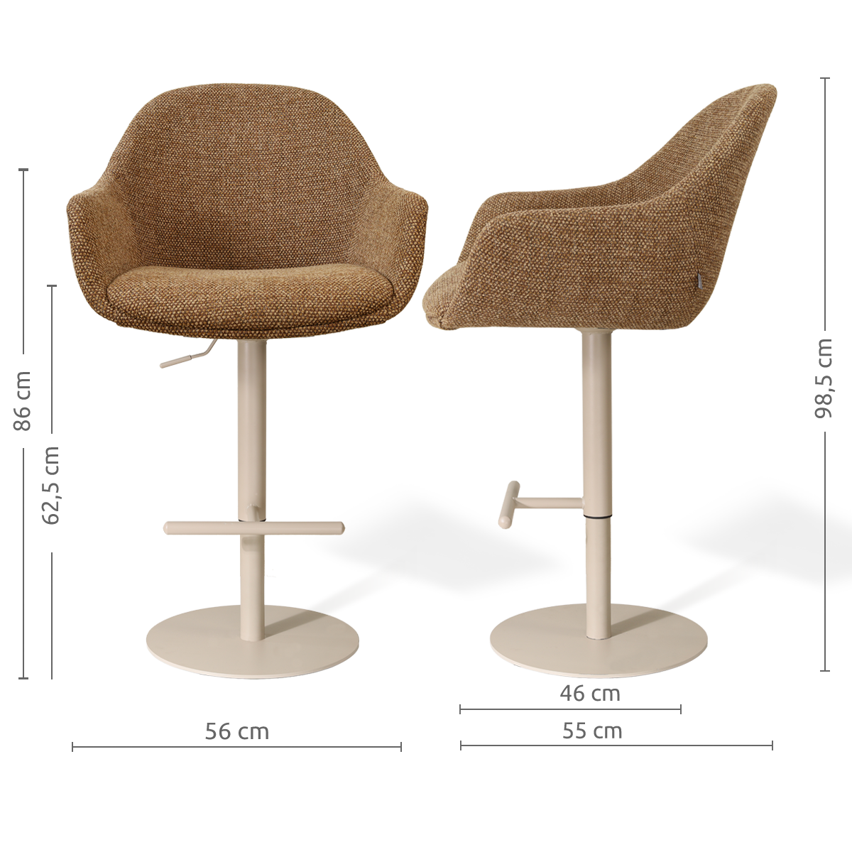 Twijfel je over de juiste zithoogte aan je kookeiland of bartafel? Met de Niva-Mae barkruk zit je altijd goed. De Niva-Mae barkruk met tulp onderstel brengt comfort en flexibiliteit samen aan je kookeiland. Dankzij het grote bereik in zithoogte stel je de barkruk eenvoudig af, zodat hij perfect past bij jouw bartafel of kookeiland. De stoffen zitting met armleuningen zorgt voor een warme en ontspannen sfeer, terwijl je comfortabel zit — ook als je wat langer blijft hangen. Het tulp onderstel geeft de barkruk een stabiele basis en zorgt voor een rustige, open uitstraling aan het kookeiland. Dankzij de draaifunctie beweeg je soepel mee en schuif je gemakkelijk aan. De zachte vormen maken deze barkruk een mooie aanvulling op een Scandinavisch of Japandi interieur. Perfect voor een snelle koffie in de ochtend, een borrelmoment of een lange avond aan het kookeiland. Tips & adviesMet een paar eenvoudige tips blijft je stoel mooi en prettig in gebruik: