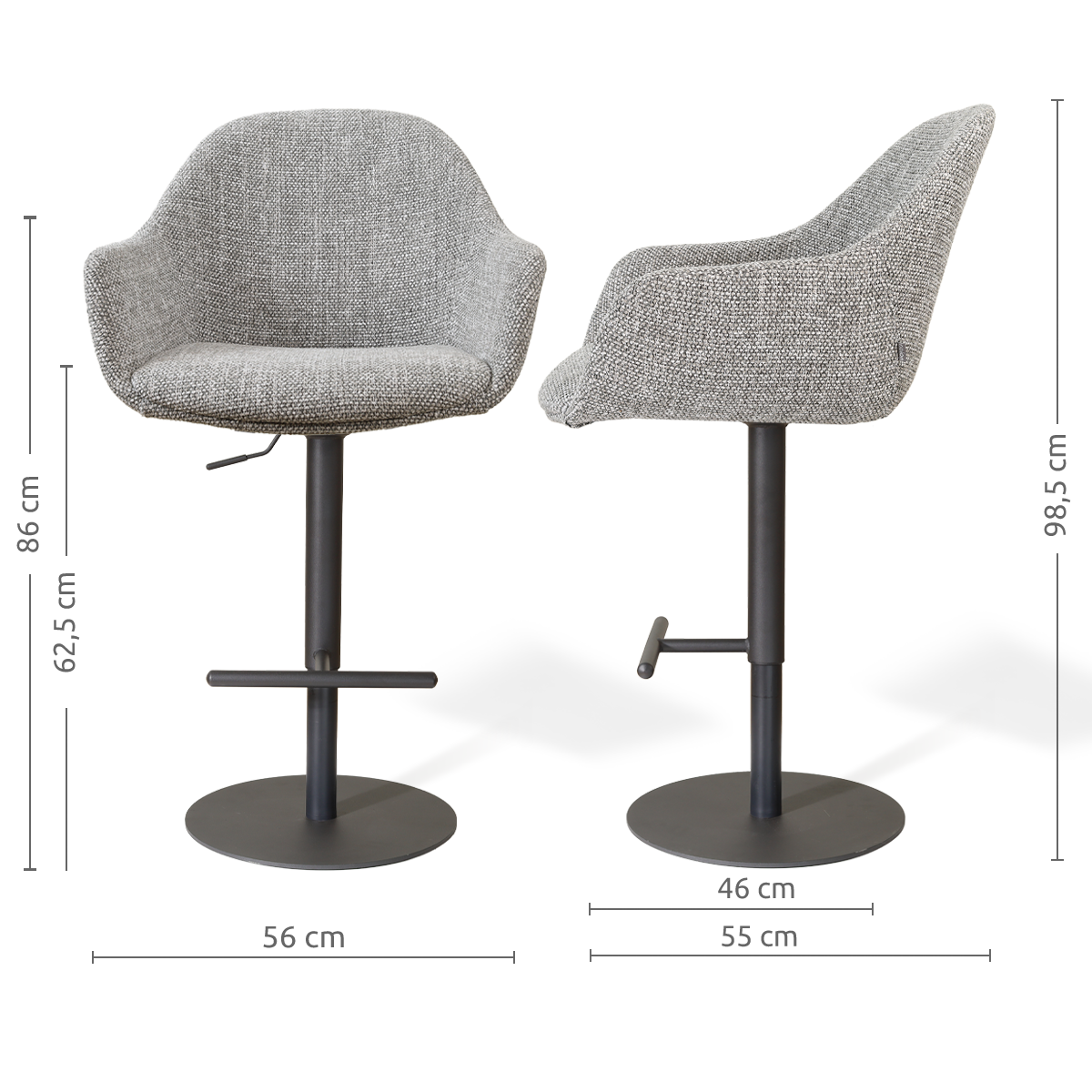 De Niva-Mae barkruk met zwart tulp onderstel combineert flexibiliteit met een krachtige, moderne uitstraling aan je kookeiland. Dankzij de verstelbare zithoogte pas je de barkruk eenvoudig aan op jouw kookeiland of bartafel. Het ruime bereik zorgt ervoor dat je altijd comfortabel zit, ongeacht de hoogte. De draaifunctie maakt het aanschuiven en opstaan extra makkelijk, zonder de barkruk te hoeven verplaatsen. De stoffen zitting met armleuningen zorgt voor een warme en ontspannen zit, terwijl het mat zwarte tulp onderstel de barkruk een stabiele basis en een strak, ruimtelijk karakter geeft. Zo blijft de ruimte rondom je kookeiland rustig en overzichtelijk. De zachte vormen zorgen voor een mooie balans met het zwarte onderstel en maken deze barkruk geschikt voor een Scandinavisch of Japandi interieur. Perfect voor een snelle koffie, een borrelmoment of een lange avond aan het kookeiland. Tips & adviesMet een paar eenvoudige tips blijft je stoel mooi en prettig in gebruik: