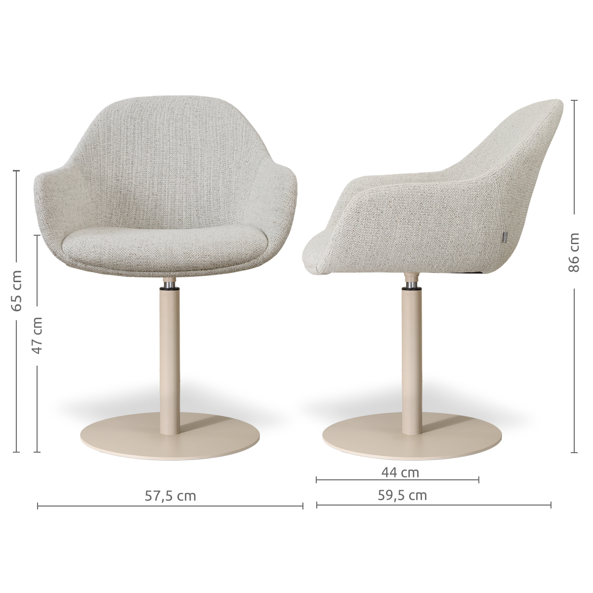 De Niva-Mae tulp eetkamerstoel beige heeft een zachte, lichte uitstraling en is een subtiele blikvanger aan je eettafel. Deze eetkamerstoel met een beige tulp onderstel combineert comfort met een rustige, moderne uitstraling. De stoffen zitting met armleuningen zorgt voor een warme en ontspannen sfeer aan tafel. Het tulp onderstel in de beige kleur, geeft de stoel een stabiele basis en zorgt voor een open, ruimtelijk effect rondom de eettafel. Het tulp onderstel zorgt voor een rustige, open basis die de eethoek luchtig laat ogen en mooi in balans houdt. De zitting is volledig draaibaar, waardoor je soepel aanschuift en gemakkelijk opstaat, zonder de stoel te hoeven verschuiven. De zachte vormen maken deze stoel een mooie aanvulling op een Scandinavisch of Japandi interieur. Een fijne plek voor lange diners en goede gesprekken aan tafel. Tips & adviesMet een paar eenvoudige tips blijft je stoel mooi en prettig in gebruik: