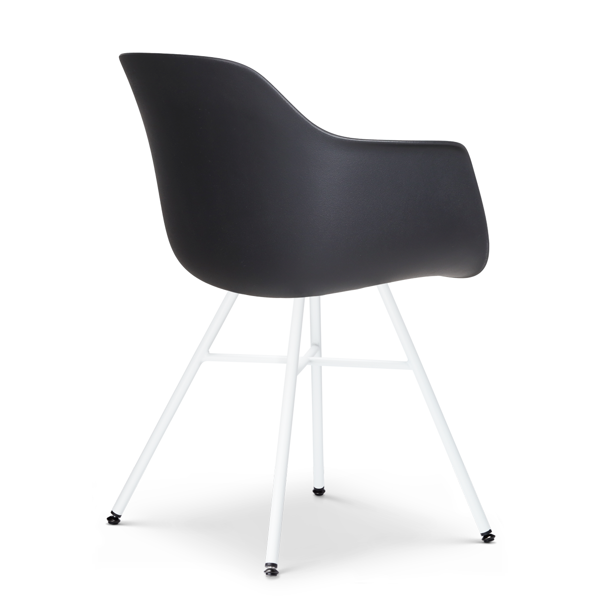 De stoel is afgewerkt met een wit metalen onderstel met een kruis als detail