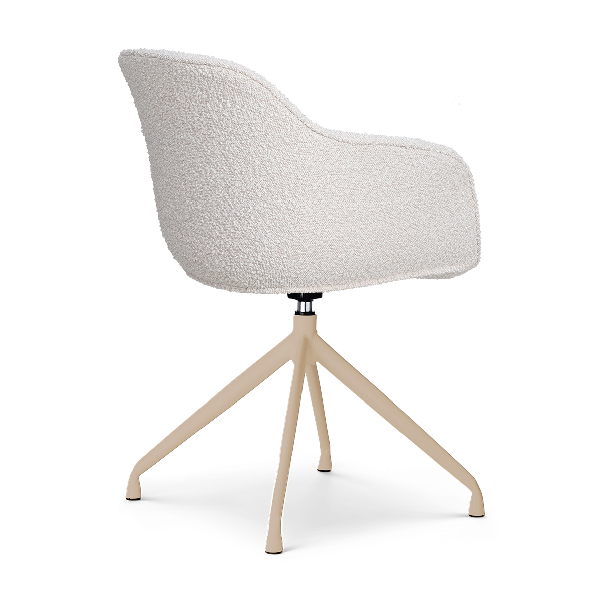 Het beige draaibare onderstel geeft de stoel een warme, zachte uitstraling en zorgt ervoor dat de zitting soepel kan meedraaien. Hierdoor kun je gemakkelijk plaatsnemen of opstaan zonder de stoel te verschuiven, wat de stoel extra praktisch maakt in dagelijks gebruik.