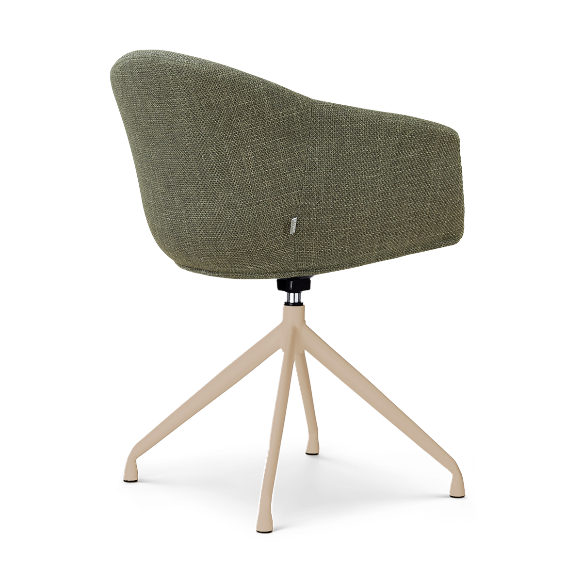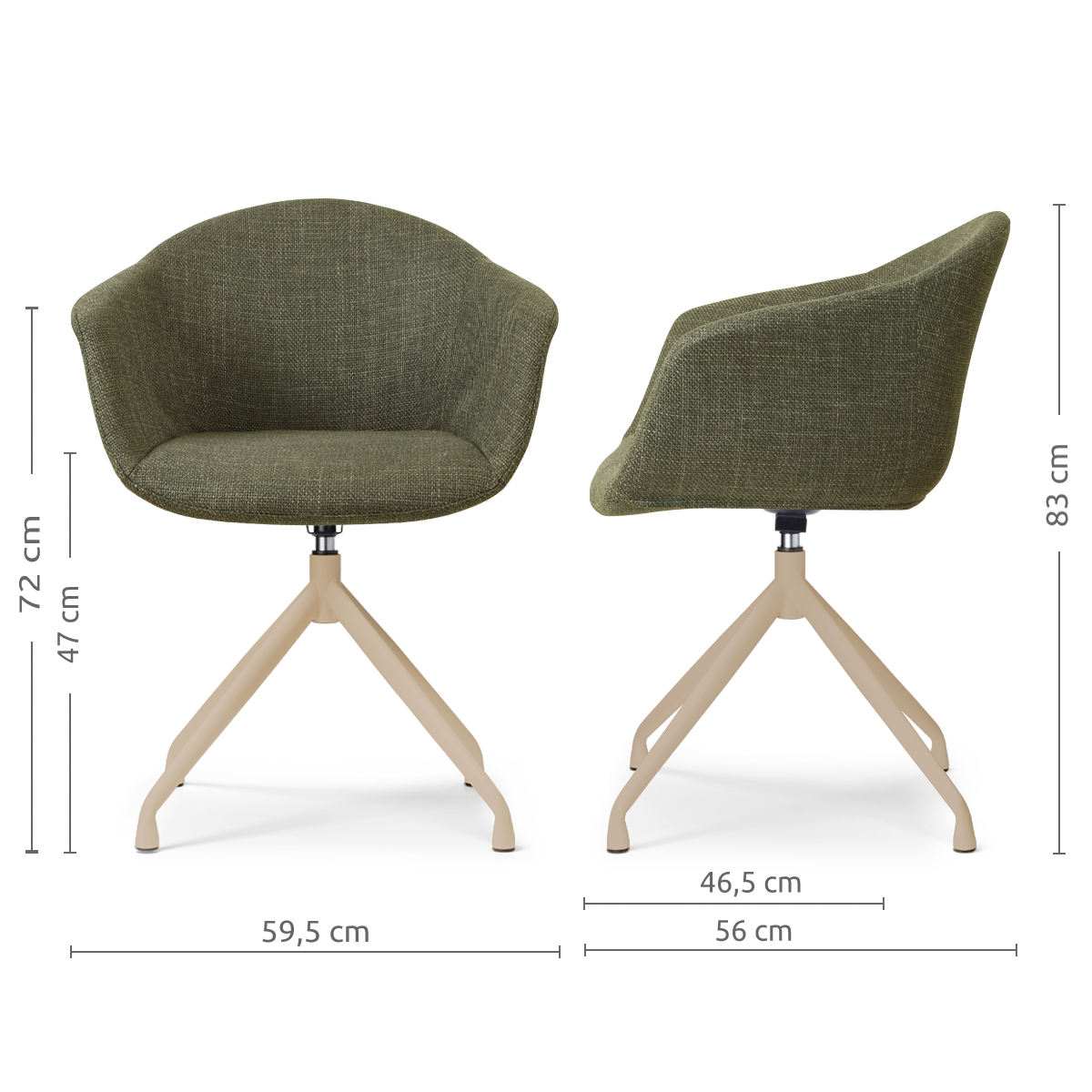 Het beige draaibare onderstel geeft de stoel een rustige, warme uitstraling en zorgt er tegelijkertijd voor dat de zitting soepel meedraait. Hierdoor kun je gemakkelijk aanschuiven of opstaan zonder de stoel te verschuiven — praktisch en comfortabel in dagelijks gebruik.