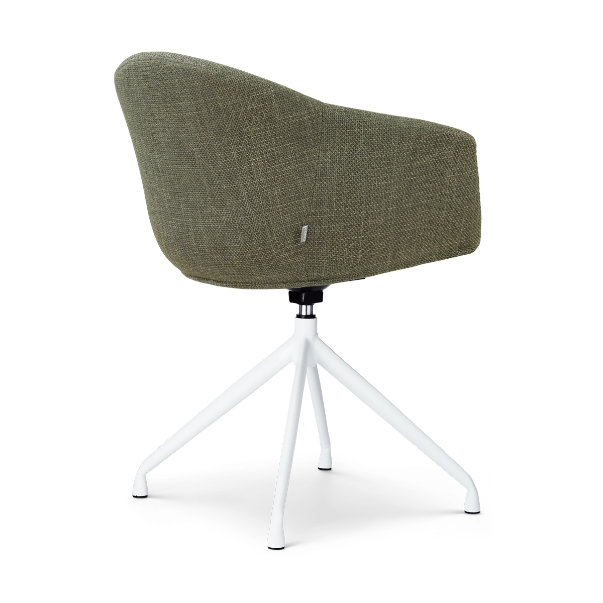 forestgroene draaibare eetkamerstoel met wit metalen onderstel De diepe forestgroene stoffering van de Nola-Otis krijgt een frisse, moderne twist door het witte draaibare onderstel. Het draaimechanisme maakt de stoel zeer gebruiksvriendelijk, terwijl de oplopende armleuningen en zachte bekleding zorgen voor comfort en stijl. Perfect voor een Scandinavisch of Japandi interieur. Onderhoudstips voor een lange levensduurMet deze tips houd je jouw eetkamerstoel zo lang mogelijk mooi: