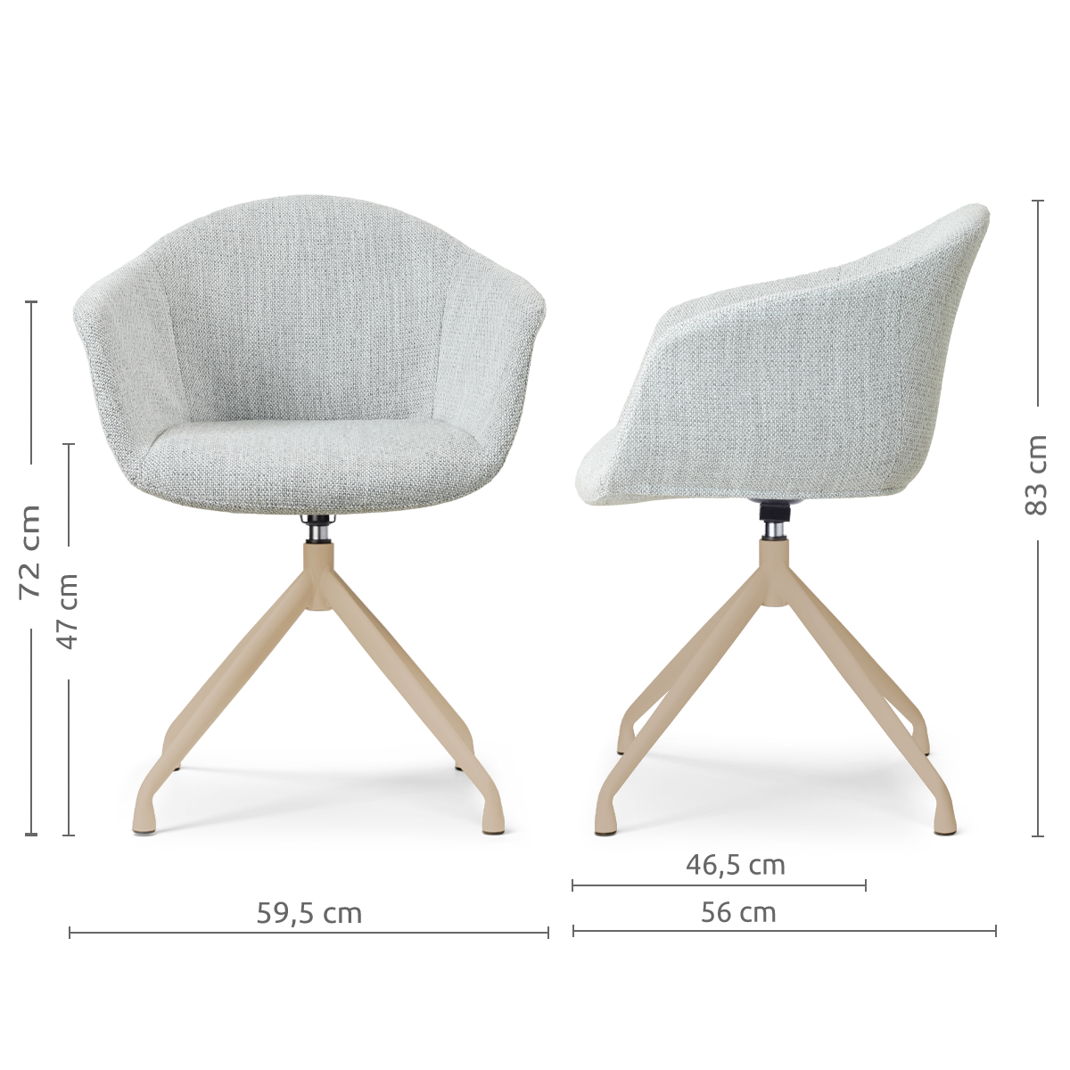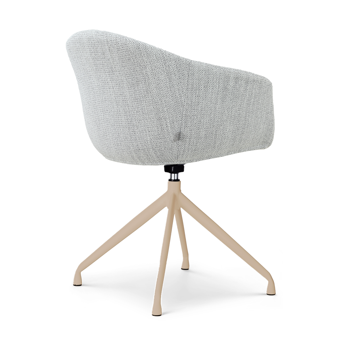 Het beige draaibare onderstel geeft de stoel een rustige, warme uitstraling en zorgt er tegelijkertijd voor dat de zitting soepel meedraait. Hierdoor kun je gemakkelijk aanschuiven of opstaan zonder de stoel te verschuiven — praktisch en comfortabel in dagelijks gebruik.