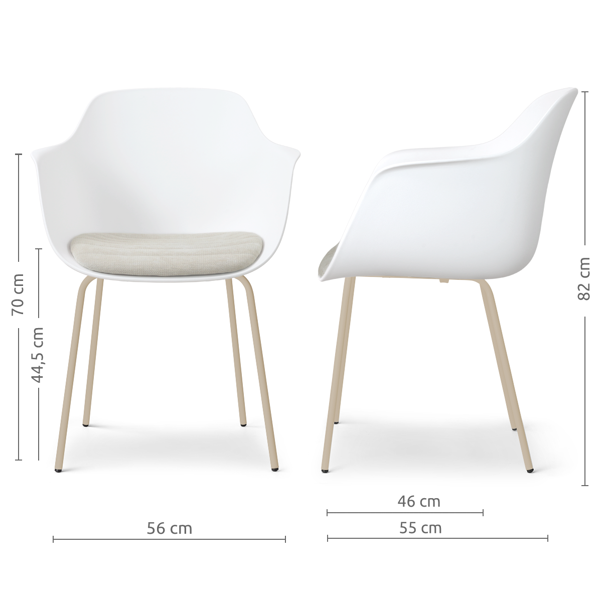 De Nora-Liz eetkamerstoel met beige metalen onderstel van Nolon combineert een strak en modern ontwerp met extra zitcomfort. De kunststof kuipzitting geeft de stoel een minimalistische uitstraling, terwijl het vaste zitkussen zorgt voor een zachte en comfortabele zitplek aan de eettafel. De zitting armleuningen biedt ondersteuning tijdens het zitten. De licht gebogen rugleuning volgt de vorm van de rug, terwijl het vaste zitkussen zorgt voor extra comfort tijdens lange diners of gezellige momenten aan tafel. Het slanke witte metalen Nora onderstel geeft de stoel een frisse en luchtige uitstraling. De poten vormen een stabiele basis en laten het moderne ontwerp van de kuipzitting mooi naar voren komen. Dankzij de combinatie van onderhoudsvriendelijke materialen en een tijdloos ontwerp past deze kunststof eetkamerstoel met armleuningen en vast zitkussen perfect in een Scandinavisch, modern of Japandi interieur. Plaats meerdere stoelen rond de eettafel voor een rustig geheel of combineer verschillende kleuren zitkussens voor een speels en persoonlijk effect in de eetkamer. Tips & adviesMet een paar eenvoudige tips blijft je stoel mooi en prettig in gebruik: