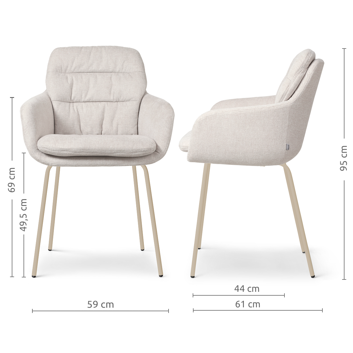 Het beige metalen Nora onderstel vormt een stabiele basis en geeft de eetkamerstoel een moderne uitstraling. De kruisverbinding tussen de poten zorgt voor extra stevigheid, terwijl de verstelbare voetpootjes ervoor zorgen dat de eetkamerstoel stabiel staat op verschillende vloeren.