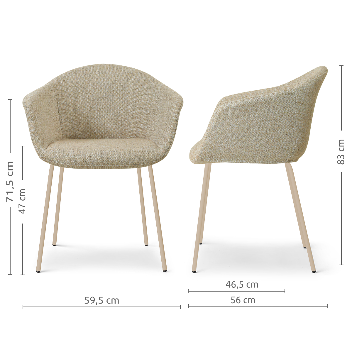 De Nora-Otis eetkamerstoel met beige metalen onderstel van Nolon combineert een zachte uitstraling met comfortabel zitgemak aan de eettafel. Dankzij de lichte stoffen bekleding en de ronde vormen heeft deze eetkamerstoel een rustige, warme uitstraling die goed past in een modern interieur. De beklede zitting met armleuningen zit comfortabel en ondersteunt je goed. De licht gebogen rugleuning sluit mooi aan op je lichaam, zodat je ontspannen aan tafel zit. Het slanke metalen Nora onderstel geeft de eetkamerstoel een moderne en luchtige uitstraling. De fijne poten vormen een stabiele basis en laten de zitting mooi tot zijn recht komen. Dankzij het minimalistische ontwerp en de neutrale kleurstelling past deze stoffen eetkamerstoel met armleuningen perfect in een Scandinavisch, Japandi of modern interieur. Een stijlvolle en comfortabele keuze voor aan de eettafel, maar ook mooi als losse stoel in de woonkamer of werkkamer. Tips & adviesMet een paar eenvoudige tips blijft je stoel mooi en prettig in gebruik: