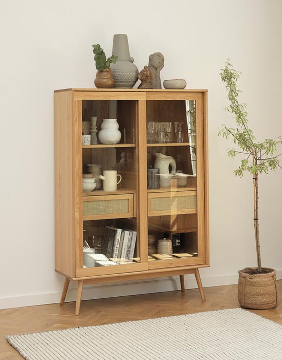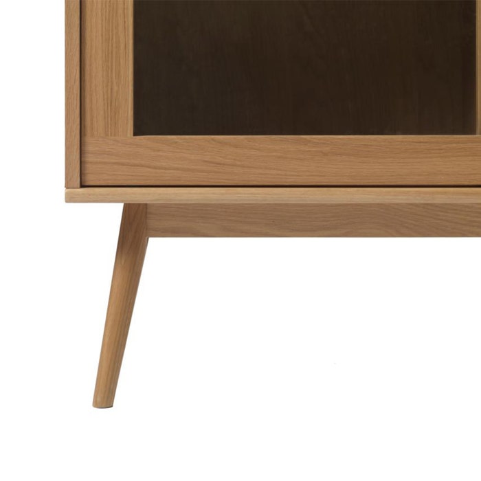 De Boas vitrinekast van Olivine is een houten kast in retro Scandinavische stijl. De kast is gemaakt van hout en is afgewerkt met een laag eiken fineer in de kleur gerookt eiken of naturel hout. De poten zijn gemaakt van massief eikenhout. Het vintage ontwerp zorgt voor warmte in het interieur en geeft de kast bovendien een echte retro uitstraling. De combinatie met het rattan in de twee lades geeft de vitrinekast nét dat beetje extra. De twee schuifdeuren van de kast zijn voorzien van glas, waardoor Boas de perfecte keuze is als je je persoonlijke spullen tentoon wilt stellen. Maak je inrichting compleet met de andere meubels uit de Boas serie van Olivine. Voordelen