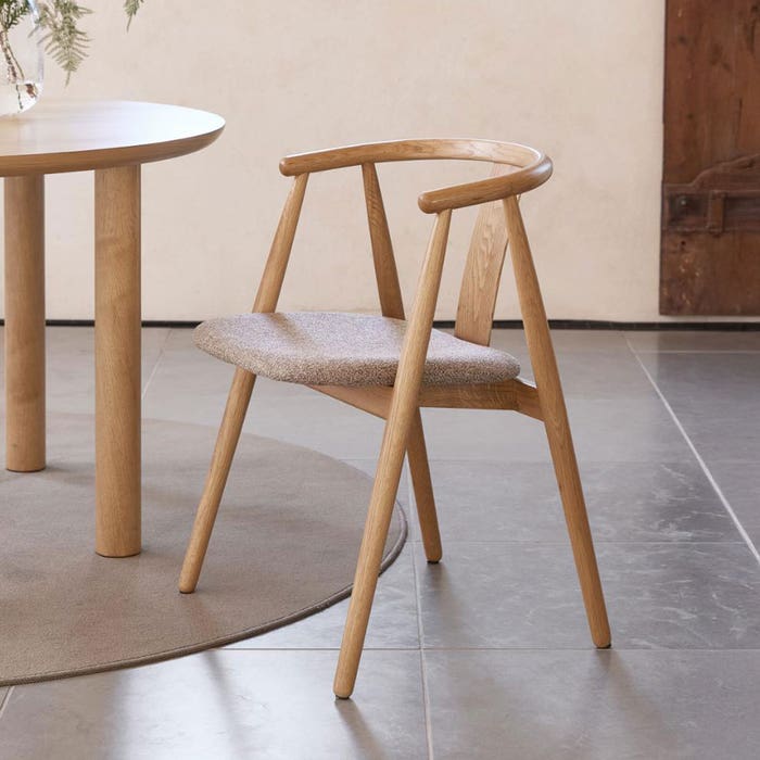De Kenza eikenhouten eetkamerstoel van het merk Olivine is zowel stijlvol als comfortabel dankzij de armleuning en stoffen ziting.