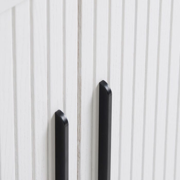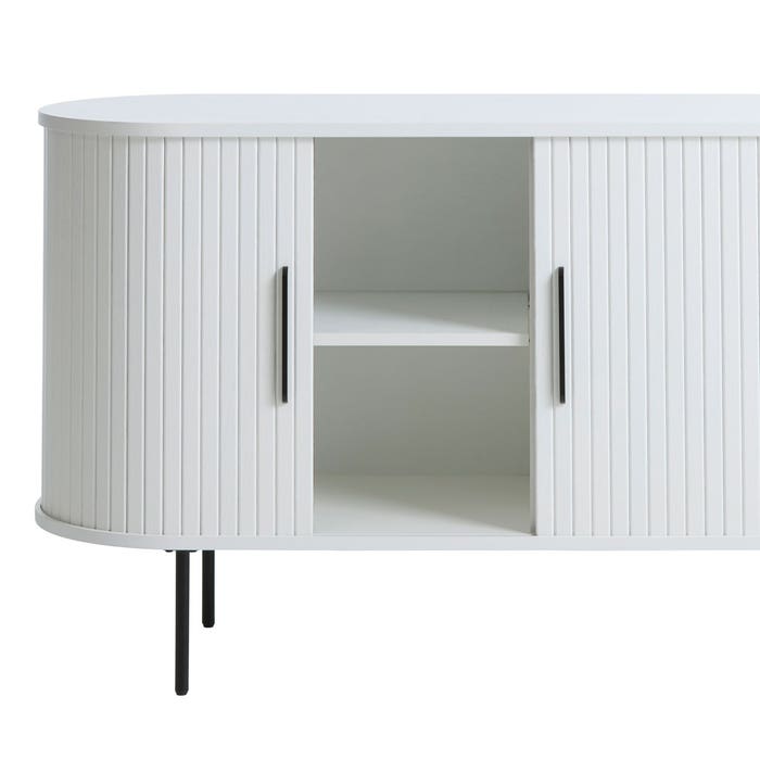 De Lenn houten sideboard is een trendy ovaal dressoir van het merk Olivine. De sideboard is gemaakt van hout en afgewerkt met een laag eikenfineer. Het dressoir heeft een modern ontwerp met een opvallende ovale vorm. De kast is ontworpen met een verticale groefstructuur in het hout, die ervoor zorgt dat de kast extra opvalt in je interieur. Door de slanke metalen poten oog de kast luchtig en ruimtelijk. Achter de twee schuifdeuren bevinden zich zes vakken waarin je spullen kan opbergen. Maak de sideboard af met wat mooie accessoires op de bovenkant zoals een lamp, plant of kandelaars. Voordelen