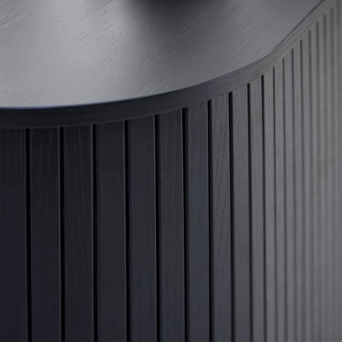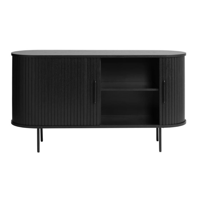 De Lenn houten sideboard is een trendy ovaal dressoir van het merk Olivine. De sideboard is gemaakt van hout en afgewerkt met een laag eikenfineer. Het dressoir heeft een modern ontwerp met een opvallende ovale vorm. De kast is ontworpen met een verticale groefstructuur in het hout, die ervoor zorgt dat de kast extra opvalt in je interieur. Door de slanke metalen poten oog de kast luchtig en ruimtelijk. Achter de twee schuifdeuren bevinden zich zes vakken waarin je spullen kan opbergen. Maak de sideboard af met wat mooie accessoires op de bovenkant zoals een lamp, plant of kandelaars. Voordelen