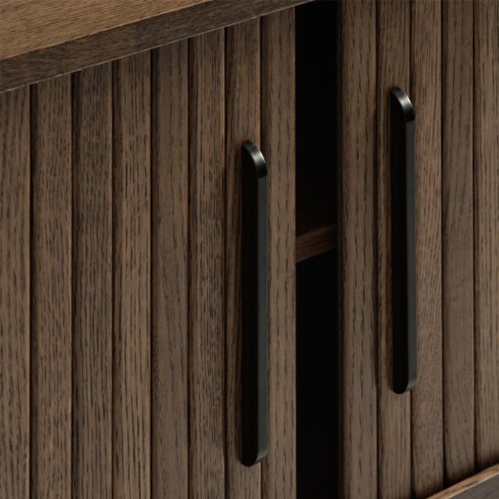 Het Lenn tv-meubel van Olivine is een modern houten tv-meubel met ovale vorm. Het tv-meubel is gemaakt van hout en is afgewerkt met een laag eiken fineer. Hierdoor heeft het meubel een natuurlijke uitstraling. De poten en handvaten van de deurtjes zijn gemaakt van metaal. De kast opent zich door middel van twee schuifdeuren, waarachter zes vakken zitten om alle bijbehorende spullen van de tv te bewaren. In de onderzijde van de kast zit een uitsparing om snoeren netjes weg te werken. Door de groefstructuur in het hout valt dit tv-meubel extra op in je interieur en heeft het een moderne en trendy uitstraling. Voordelen