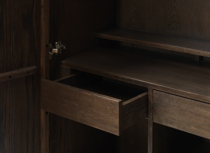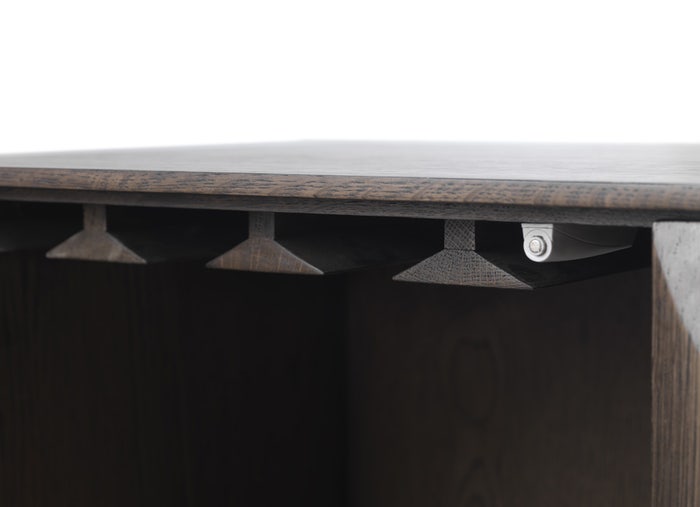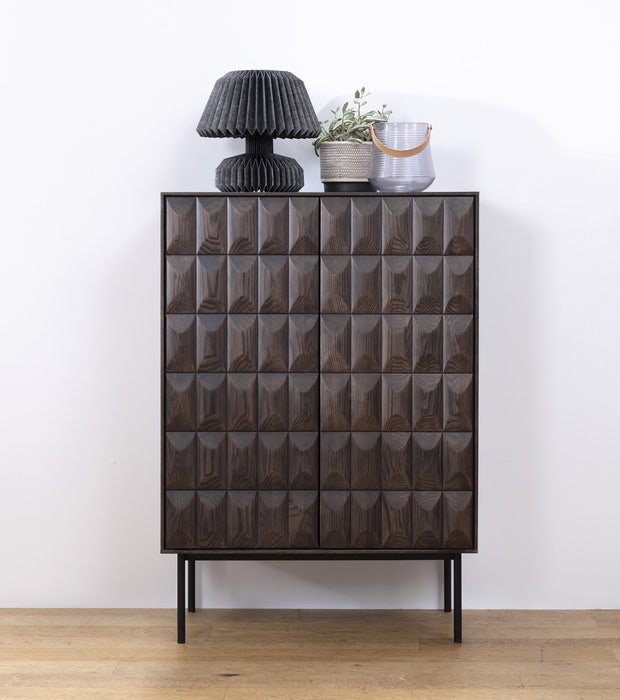 De Vanja houten drankkast van Olivine is de perfecte kast voor echte wijnliefhebbers. Deze kast biedt alle ruimte aan een uitgebreide wijn- of likeur collectie. Hang wijnglazen netjes bovenin, zet flessen en karaffen op de drie planken en gebruik de twee lades om losse accessoires in op te bergen. De Vanja kast is gemaakt van hout met een laag eikenfineer. De deuren zijn gemaakt van massief eikenhout en hebben een uniek patroon aan de buitenzijde. De combinatie van het donkere hout met de metalen poten zorgt vervolgens voor een stoere en elegante touch. Naast drankkast kan je de Vanja natuurlijk ook als gewone opbergkast gebruiken. Voordelen