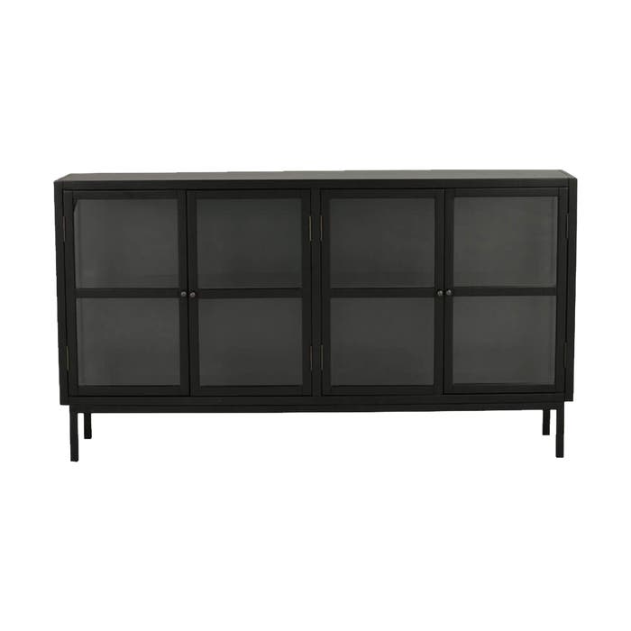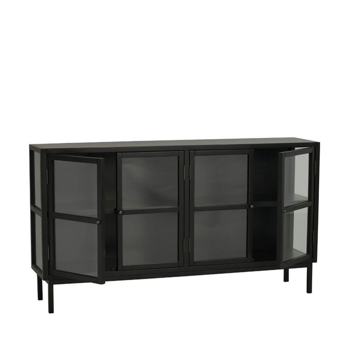"Met dit ruime Marshall sideboard van Rowico home heb je genoeg plek om je spullen netjes op te ruimen. De kast is gemaakt van gelakt zwart hout met een metalen onderstel. Door de vier glazen deurtjes en glazen zijkanten kun je jouw mooiste spullen van alle kanten goed zien. Achter de deurtjes is één plank bevestigd zodat je voldoende opbergruimte hebt. Kortom met deze moderne glazen lage vitrinekast maak je van een kale muur een eyecatcher in jouw interieur. Stijl de kast af door niet alleen in de kast mooie accessoires neer te zetten, maar ook bovenop de kast. Voordelen