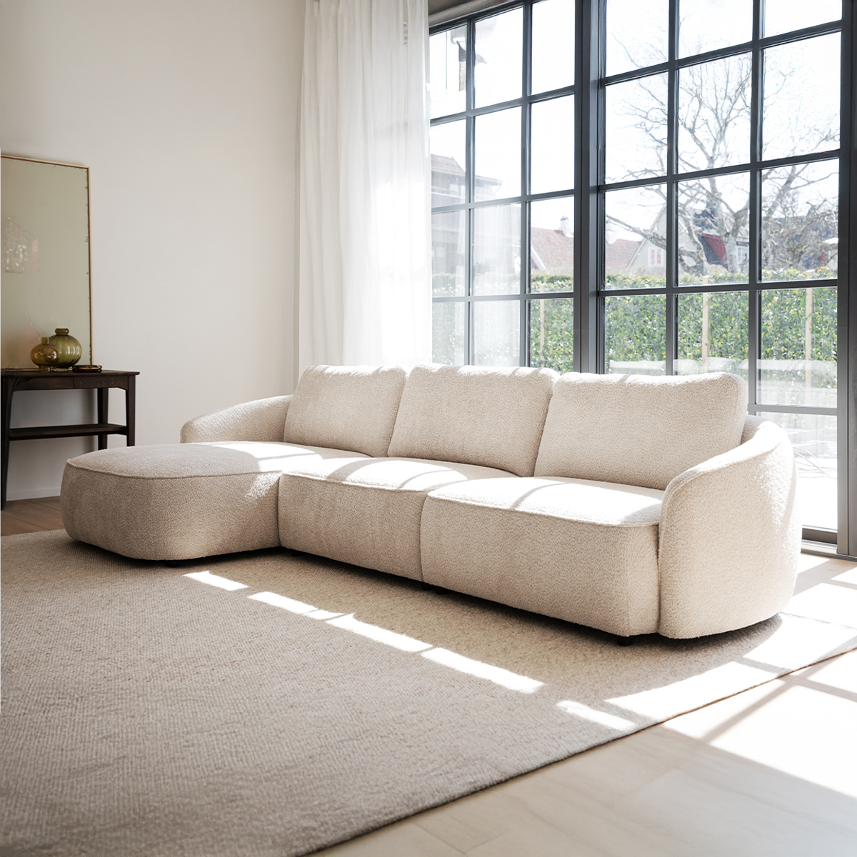 Dankzij het royale formaat biedt deze bank ruimte voor het hele gezin – of voor een avond heerlijk languit op je eentje. De afgeronde vormen en het luchtige, organische design geven de bank een vriendelijke uitstraling die perfect past in een modern, Scandinavisch of Japandi interieur. De losse rugkussens zorgen voor een comfortabele, nonchalante look en geven je de vrijheid om te schikken zoals jij wilt. Onder de zitting zorgen duurzame nozag veren voor een stevige en comfortabele zit. De chaise longue aan de linkerkant maakt het plaatje compleet: een luxe plekje om te relaxen, lezen of gewoon even niks te doen. De Norris is bovendien met zorg geproduceerd in Europa en gemaakt van FSC®-gecertificeerd hout. Mooi én verantwoord.