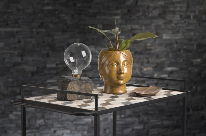 De Karv keuken trolley van Villa Collection is een serveerwagen met een chique retro ontwerp. De Karv trolley is 81 cm breed, 46 cm diep en 83 cm hoog. Deze bar trolley is gemaakt van metaal met een zwarte poedercoating, en het blad is handgemaakt van 3 soorten natuursteen. De trolley staat op vier wieltjes dus je kan hem gemakkelijk van plek wisselen, en met de wielremmen houd je hem juist stabiel op zijn plek. Het bovenste blad heeft aan drie zijden een reling zodat spullen er niet vanaf vallen, en bovendien zitten er handvaten aan beide zijden. Voordelen